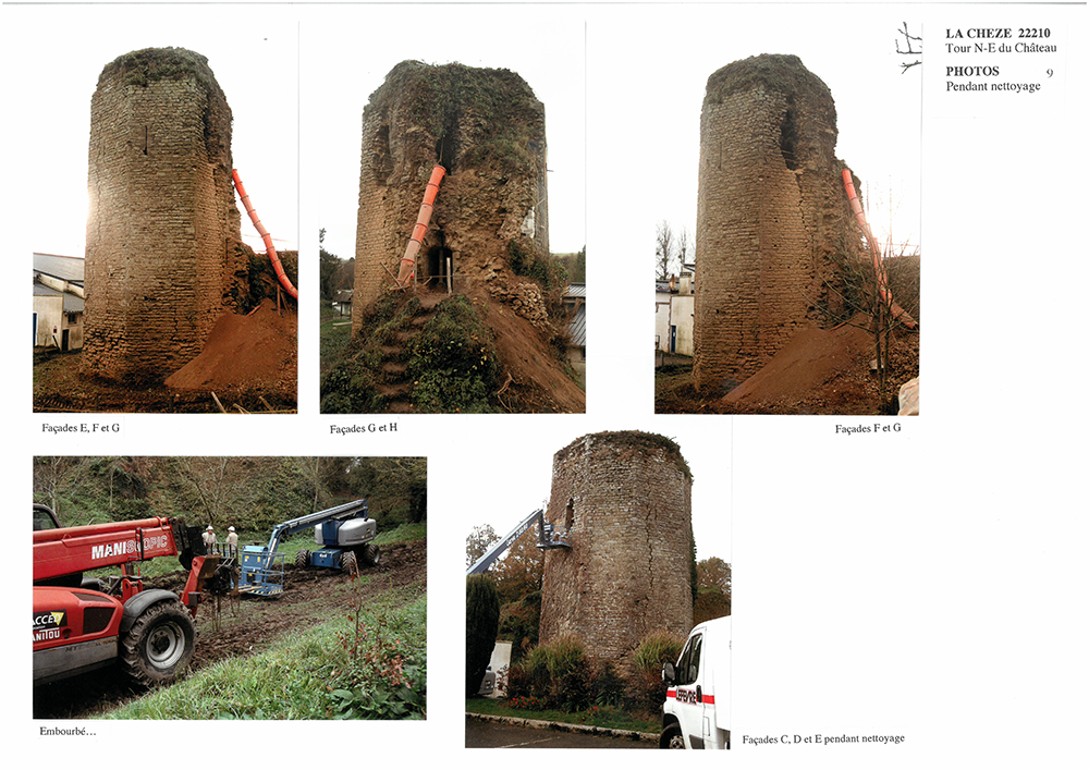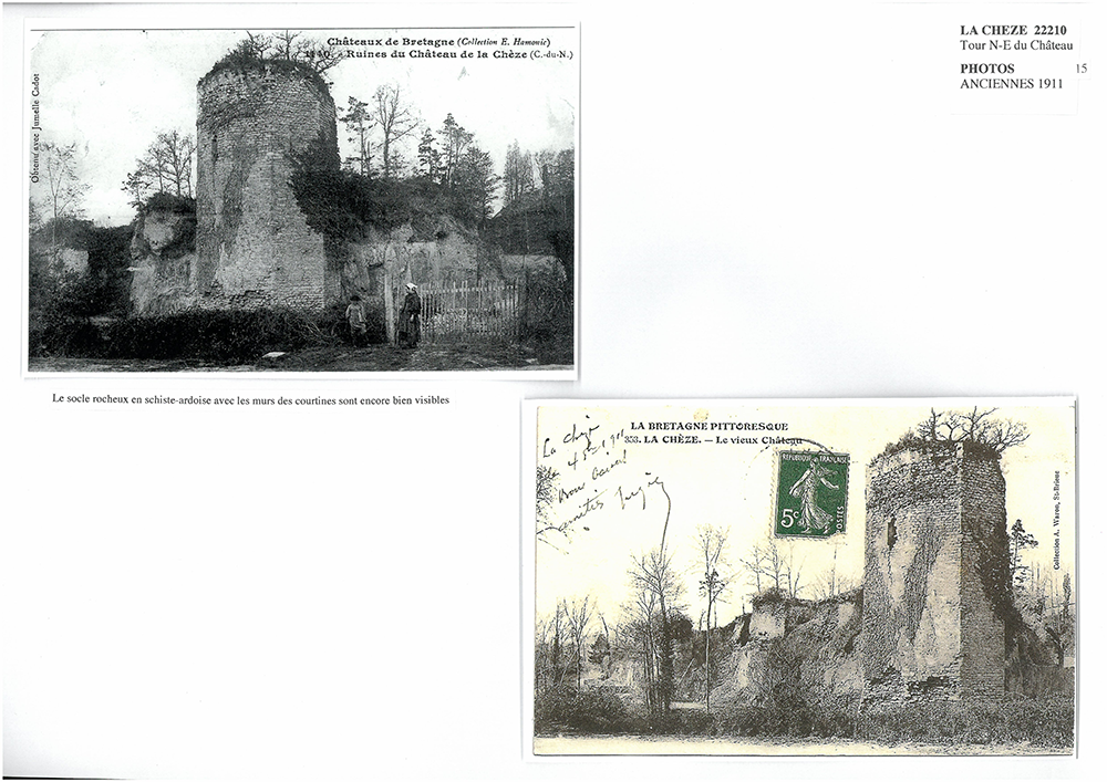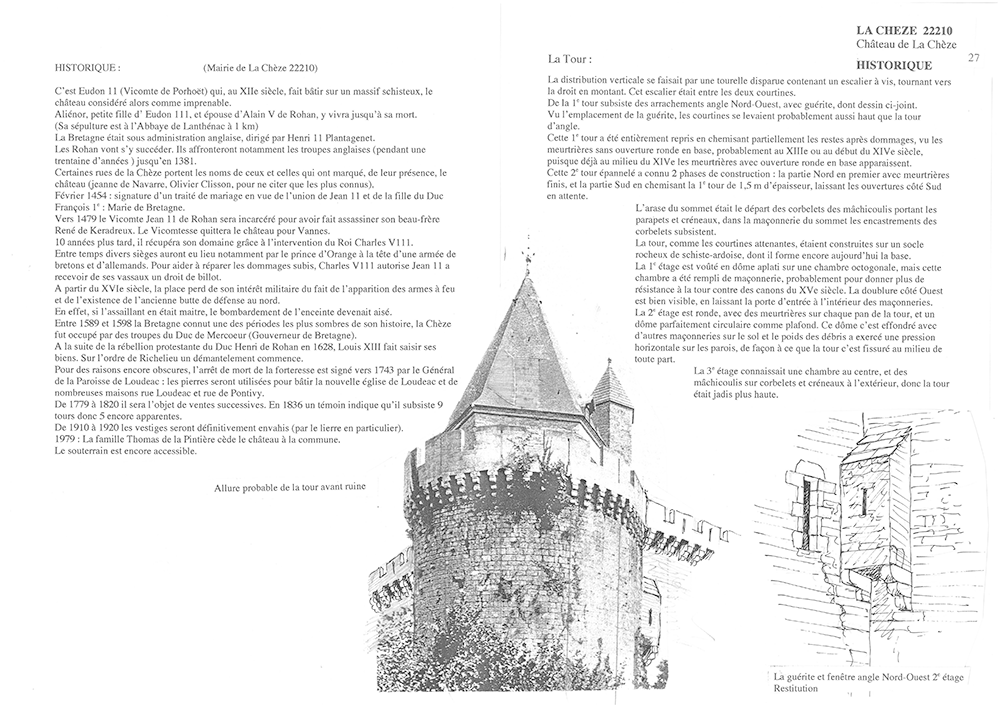 Le donjon octogonal fut construit à la fin du 14e siècle pour Olivier de Clisson, seigneur de la Chèze depuis 1370 par acquêt de la châtellenie de Josselin. Au cours du 15e siècle, le château de la Chèze est la principale résidence des Rohan qui y installent leur chambre des comptes. De grands travaux de renforcement de l’enceinte sont faits au 15e siècle pour les Rohan. En 1488, l’armée ducale, commandée par le maréchal de Rieux, investit le château. Après 1495, Jean II de Rohan aménage le château en résidence, en même temps qu’il reconstruit le château de Josselin. Au XVIème siècle, la place perd de son intérêt du fait de l’apparition des armes à feu. Vers 1628, sur les ordres de Richelieu, les tours sont démantelées comme à Josselin. En 1743, l’autorisation de dépecer le château au profit de la fabrique de Loudéac (les pierres vont servir à la construction de l’église) est donnée. En 1836, il subsiste 9 tours dont 5 apparentes. Vers 1857, les vestiges sont quasiment détruits en totalité.
