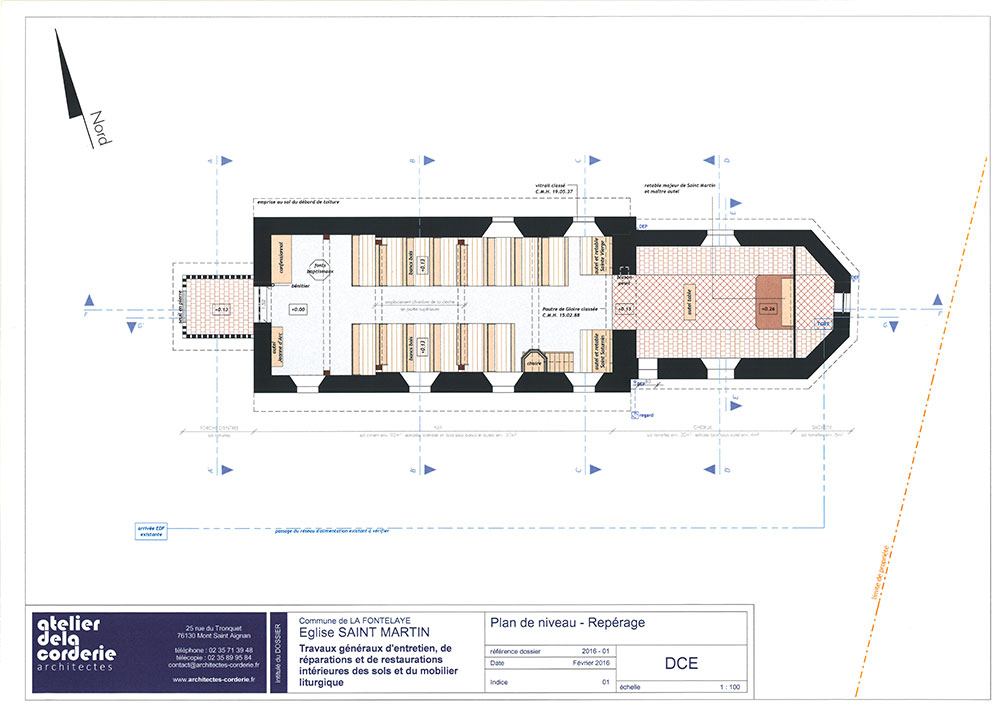 L’église est faite d’un plan très simple composé d’une nef unique à laquelle on accède par un petit porche en pan de bois avec une couverture à croupe, et un choeur plus étroit que la nef à chevet plat.
