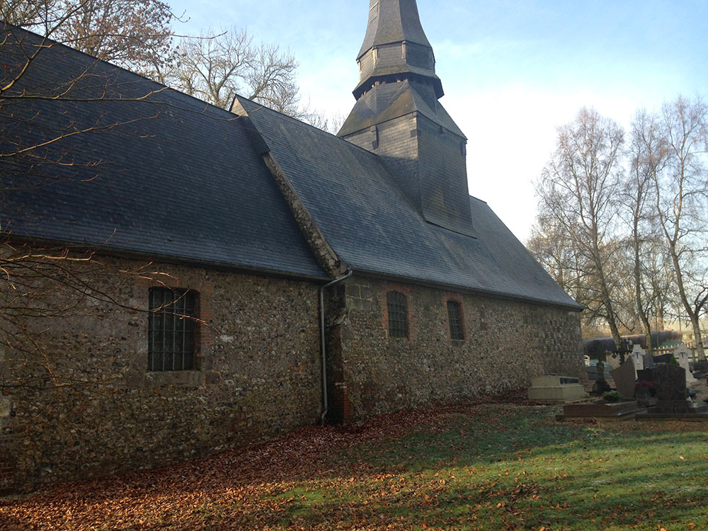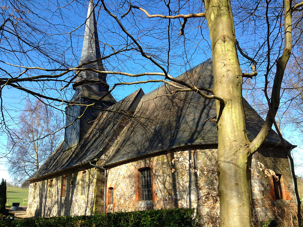 Les murs sont en différents matériaux locaux : bois, silex, brique, calcaire… Elle est couverte d’une charpente lambrissée et entourée d’un cimetière. IL s’agit d’un édifice du XVIe siècle bâti sur des vestiges du XIIe siècle.