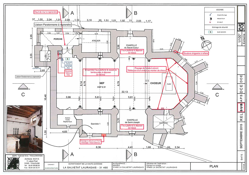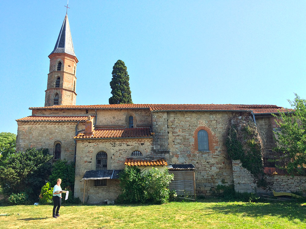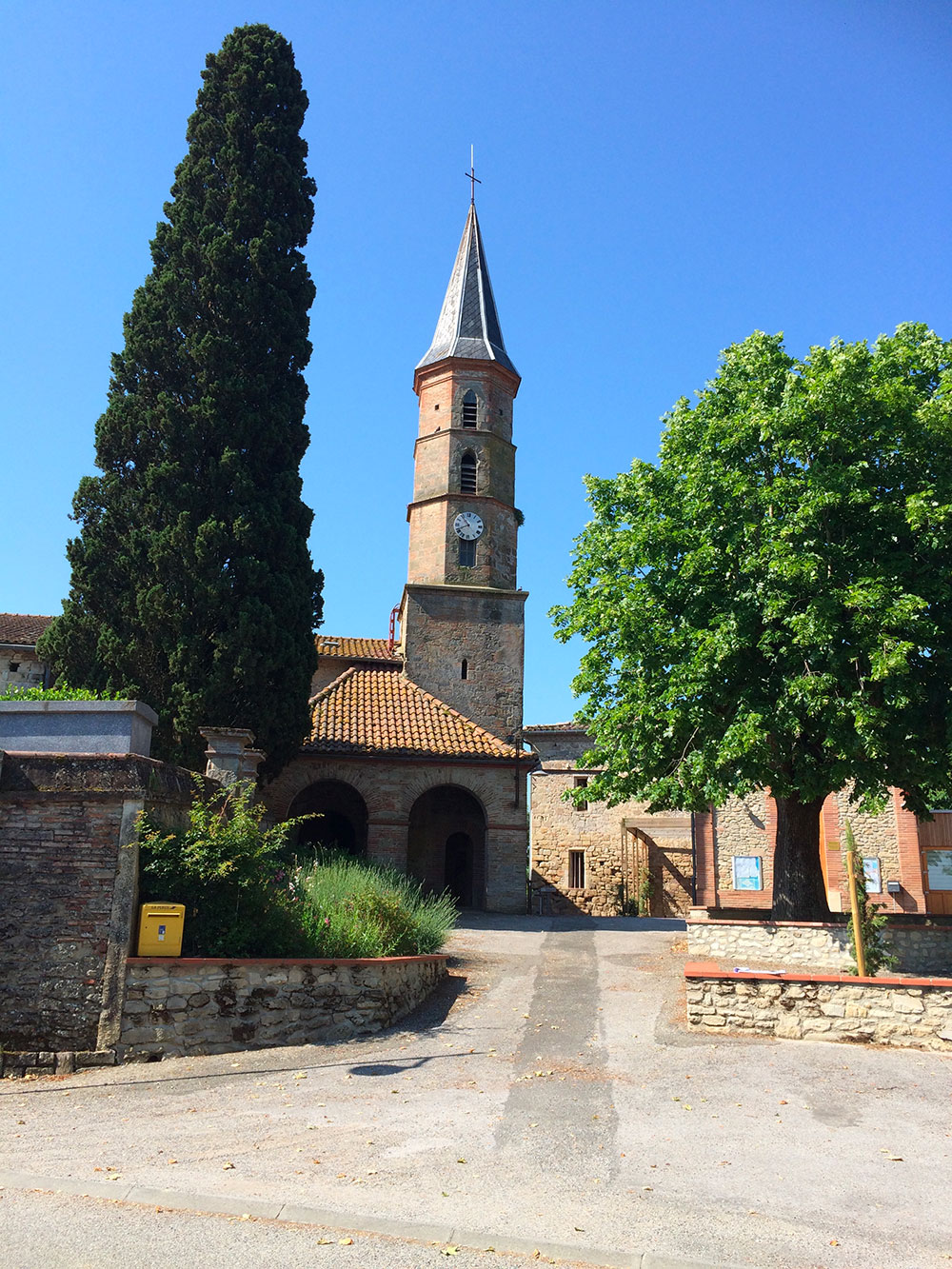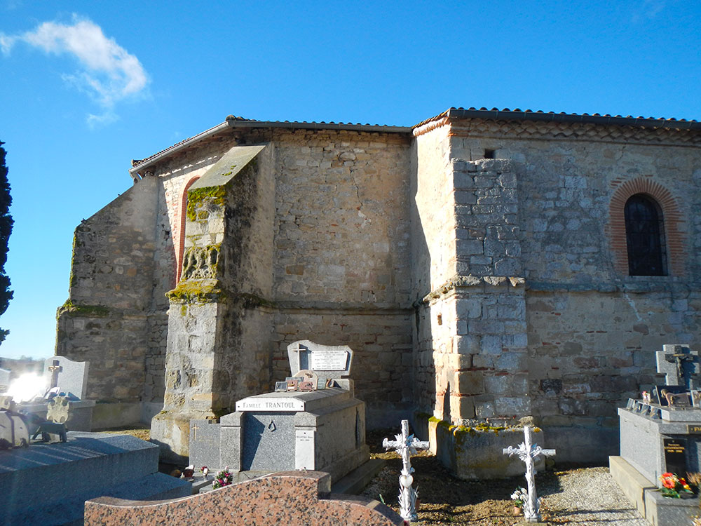 Un porche permet l’accès au clocher et à la nef le long de la première travée au nord. Deux autres bâtiments adossés à l’église le long de la deuxième travée, au nord et au sud servent l’un d’atelier et l’autre de sacristie. Une deuxième sacristie est accolée au mur sud du choeur. Les murs sont en moellons de schiste et les couvertures en tuiles creuses.