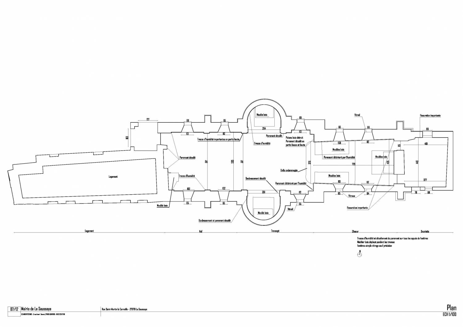 Le plan de base de l’église est rectangulaire, composé d’une nef de quatre travées, la troisième étant encadrée de deux chapelles latérales à absides semi-circulaires formant un faux transept et profond choeur de deux travées, à chevet plat. Une sacristie de plan carré est adossée au chevet, à l’est.