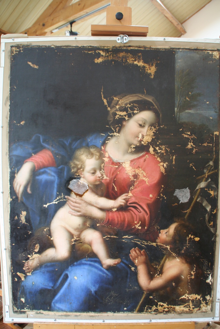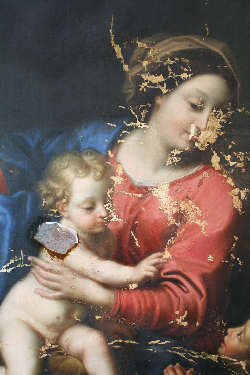 La paroisse Saint Pierre et Saint Paul de Fontenay-aux-Roses, dans les Hauts-de- Seine, renferme une toile importante attribuée récemment à Pierre Mignard. Marouflée à même le mur de l’église, celle-ci subissait des dommages importants en partie liés à l’humidité. A travers les traits et les attitudes nobles des personnages, on retrouve le style particulier de ce célèbre artiste qui fut premier peintre de la cour de Louis XIV. Si le sujet du tableau est assez commun, la composition adoptée par Mignard est originale. Elle rappelle un autre de ses tableaux, La vierge à l’Enfant et le petit saint Jean, conservé au musée des Beaux Arts d’Angers.