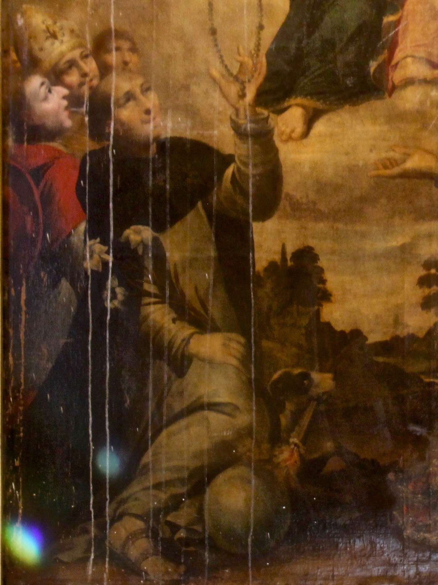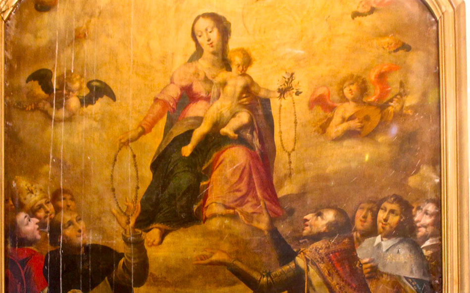 Le tableau évoque donc la scène du rosaire, exercice de piété catholique dédié à la Vierge, qui consiste à réciter quatre chapelets d’oraisons. Bien que ce thème soit courant dans l’iconographie religieuse, la présence d’un souverain au pied de la Vierge est beaucoup plus rare. De fait, c’est le plus souvent sainte Catherine qui accompagne saint Dominique dans cette représentation.