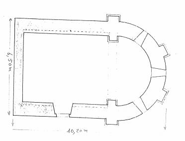 A l’intérieur, le vaisseau, voûté en berceau brisé, est percé à l’ouest d’une arcade légèrement décentrée vers le sud. A l’est, il ouvre sur l’abside par un arc doubleau brisé retombant sur des piliers massifs à imposte chanfreinée. L’abside est voûtée en cul-de-four ; la cheminée, qui y avait été installée du temps où le bâtiment servit d’habitation, a été enlevée par le propriétaire actuel. Ce dernier poursuit patiemment la restauration de l’édifice : la toiture, le pignon nord-est et le contrefort sud ont été complètement refaits.