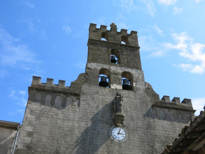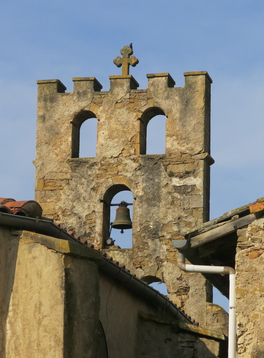 L’église se distingue également par son mur-clocher, construit en gré de Lagarde, et composé de cinq arcades abritant trois cloches, et surmontées d’un crénelage et d’une croix en pierre.