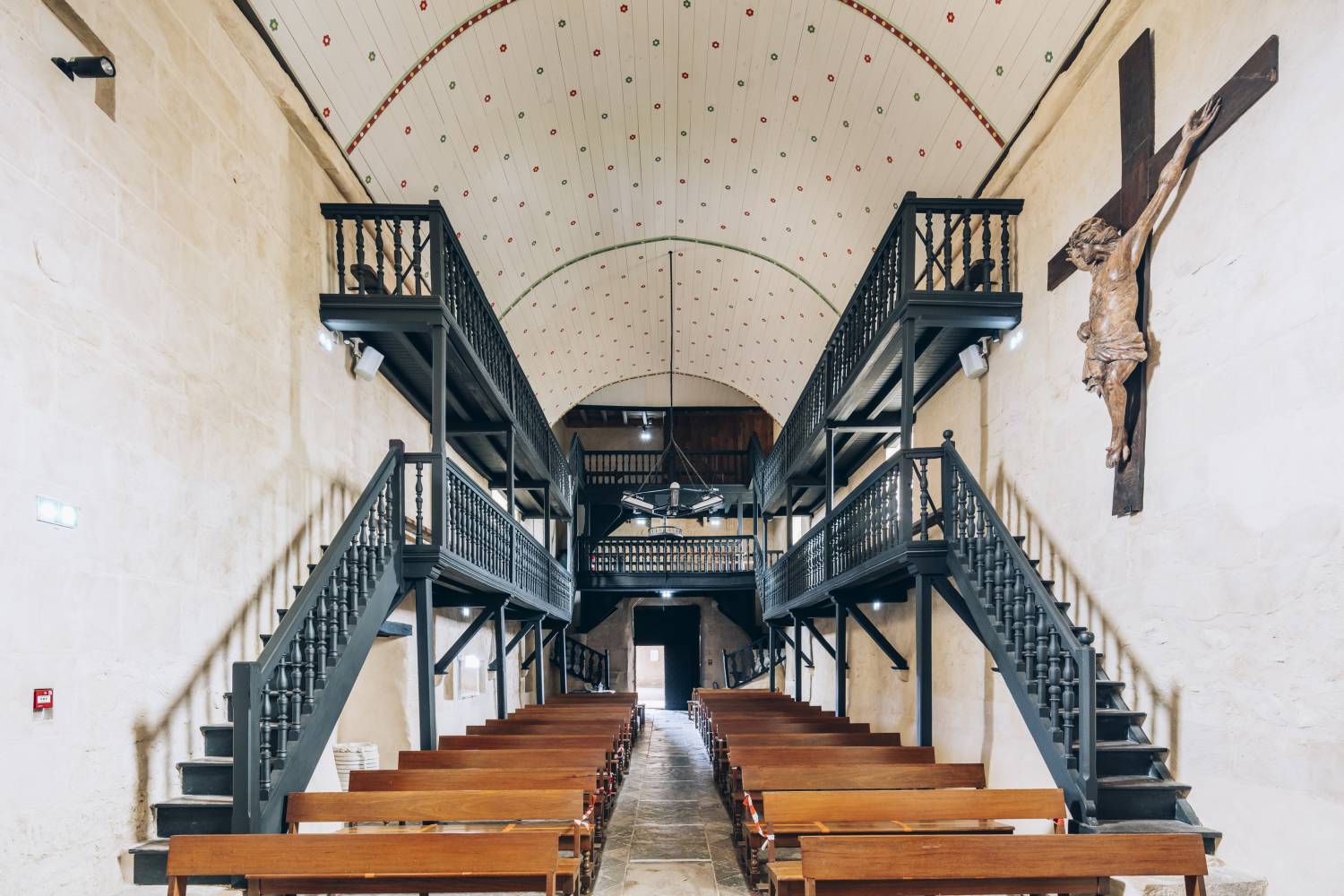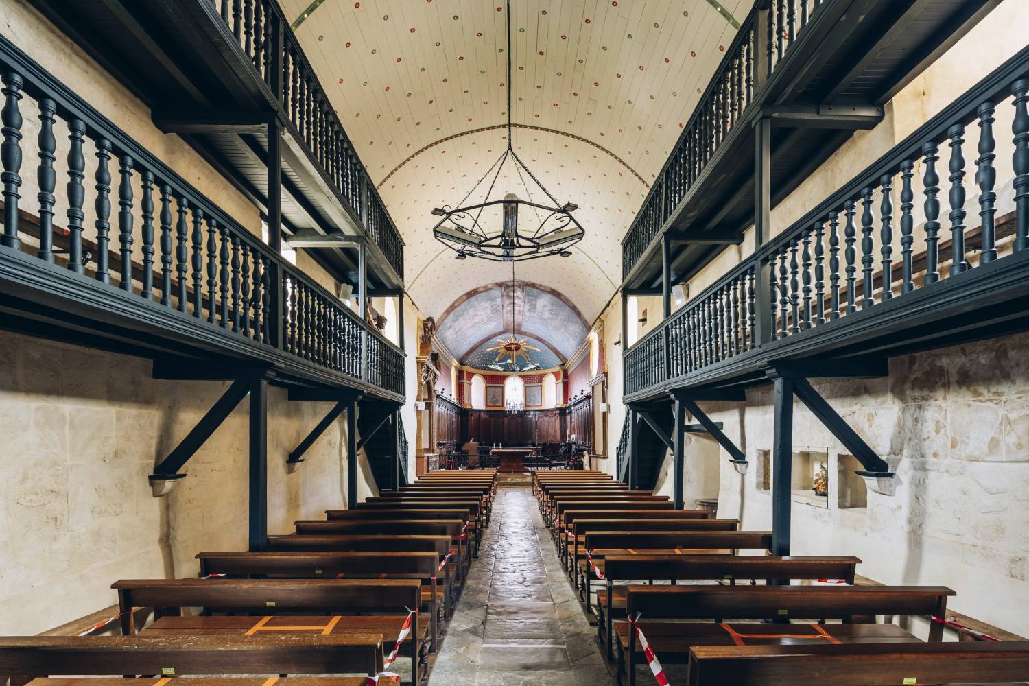 Le plan, comparable à celui de l’abbatiale d’Arthous, se signale par une nef unique très longue (35 m) de cinq travées, sans transept, terminée par une abside unique semi-circulaire, selon un modèle observé dans d’autres édifices prémontrés de la vaste province de Gascogne. Les peintures ornant le lambris, qui remontaient au XIXe s., simplifiées en 1986, ont retrouvé leur place et leur lisibilité en 2017.