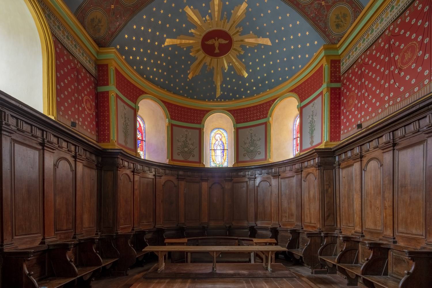 L’essentiel du décor intérieur et du mobilier a été très remanié aux époques moderne et contemporaine, avec la pose de stalles en bois ciré dans le chœur, un double niveau de tribune dans la nef. Grâce à la restauration de 2017, les voûtes du chœur et de la nef ont retrouvé un décor unifié, inspiré du XIXe s., d’aspect élégant. En juin 2018, une réflexion a été menée par différents partenaires avec la coordination de la Conservation des antiquités et objets d’art, afin d’établir un plan prévisionnel de réinstallation des objets mobiliers à l’intérieur de l’église. Ceux-ci, ainsi que les autels, sont actuellement conservés en caisse dans des réserves ; le programme de restauration entrepris en 2011 pour le tabernacle-urne se poursuit. En 2017, la statue de saint Norbert, mitré, a été restaurée ; la Vierge à l’Enfant et le Christ en croix sont en cours d’étude. Les importantes modifications subies au cours du XIXe s. par ces deux œuvres les ont cependant défigurées et rendent leurs origines indéchiffrables.