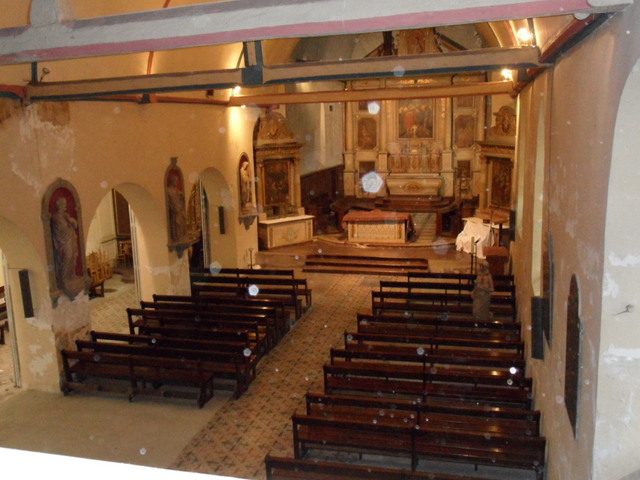 A l’est se trouve un choeur de trois travées à la couverture plus élevée que celle de la nef et au chevet plat en murs de grison.