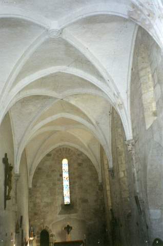 La mouluration des ogives présente un simple cavet et les clés s’ornent de rosaces. Les retombées des nervures de la voûte et des arcs formerets se font d’une manière assez originale : reçues sur un tailloir octogonal, elles sont en quelque sorte prolongées par un court faisceau de trois colonnettes, retombant lui-même sur un chapiteau à palmette engagé dans les murs gouttereaux et surmontant une fine colonne, elle aussi engagée, soutenue par des culs-de-lampe en forme de têtes, dont une féminine, hérités de la tradition romane.