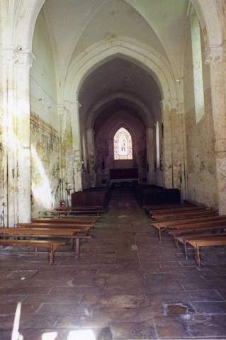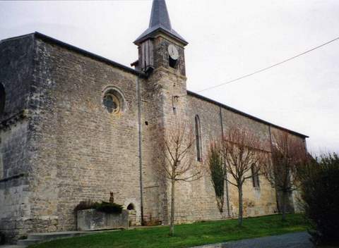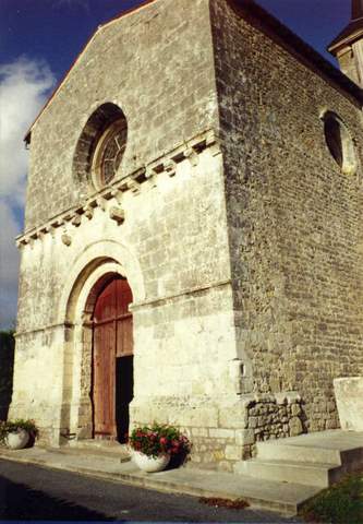 Église Saint-Pierre-ès-liens. Située dans le coin sud-est d’un tertre quadrangulaire entouré de douves jadis profondes, l’église paroissiale de Landes appartenait, sous l’Ancien Régime, à un ensemble plus vaste ; le prieuré fut vendu com me bien national. La cure était à la présentation du prieur de Tonnay-Boutonne. Le plan, rectangulaire, est très simple. Les trois travées de la nef se prolongent en une quatrième formant le chœur. Le clocher, entre la première et la deuxième travée, et un appentis, appuyé sur le chœur, font saillie sur le flanc sud de l’édifice. La façade ouest et la troisième travée, romanes, datent seules du XIIe siècle. Le reste a été rebâti, à la suite d’ un incendie, au siècle suivant : les travées sont voûtées de croisées d’ogives nervurées. L’ensemble, et en particulier le gracile clocher, a été repris au XIXe siècle. La façade occidentale, en bel appareil, est percée d’un portail en plein cintre à deux voussures. Une corniche à quatorze modillons sépare le portail d’un oculus central. Le reste de l’ édifice, sauf les chaînages d’angles et l’encadrement des fenêtres, est construit en moellons. Un autre oculus, percé dans le mur sud de la première travée, est surmonté de pointes de diamants. Ce sobre édifice forme l’écrin d’un exceptionnel ensemble de peintures murales. Découvertes en 1900, classées Monuments historiques en 1903, elles datent du XIIIe s. ou du début du siècle suivant. Le mur nord de la deuxième travée porte les scènes de l’Annonciation, de la Visitation et de la Nativité. La Vierge visitée par l’archange Gabriel est debout, tenant un livre fermé. Joseph se tient au pied du lit de la Vierge qui vient d’accoucher, tandis que l’Enfant-Jésus est couché dans une mangeoire, emmailloté, au deuxième plan. Les murs du chœur sont consacrés au Baptême du Christ et à la Passion ; il reste de l’ensemble originel une Mise au tombeau et une Mater dolorosa. Quelques scènes de chasse s’ajoute nt au cycle de la vie du Christ. Ce très bel ensemble peint a beaucoup souffert de l’humidité qui verdit les murs de l’édifice. Le maître-autel du XVIIIe s. a été classé Monument historique en 1985. D’autres objets figurent à l’Inventaire supplémentaire à la liste des objets mobiliers classés: l’autel et le tabernacle en bois sculpté, peint et doré de la chapelle sud (XVIIIe s.) et l’inscription funéraire gravée de Jacquette Ramard (1671), au mur nord. Les travaux, en 1998, ont porté sur la maçonnerie des façades nord et est, ainsi que sur le drainage général au nord et au sud qui constituaient des préalables à la conservation des peintures murales ; la Sauvegarde de l’Art français a contribué à cette première tranche à hauteur de 35 000 F.