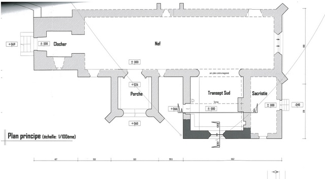 Cette église est composée d’une nef unique avec un chevet plat, un bras sud du transept. porche sud, clocher porche. Ardoise, schiste et granite, voûte lambrissée.