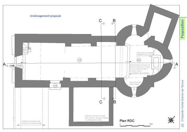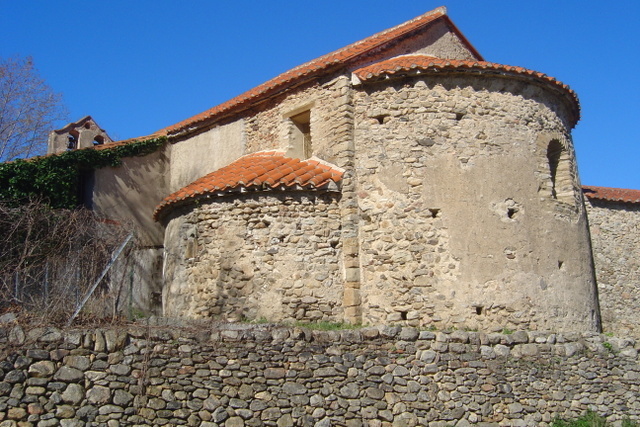 La chapelle de Tanyà est en effet un édifice roman[5], à nef unique, dont l’ abside hémi-circulaire, voûtée en cul-de-four, est précédée de deux chapelles latérales plus petites, elles aussi en forme d’abside et pareillement voûtées. Ce n’est pas véritablement un chevet triconque, puisque l’abside principale a environ le double de largeur et de hauteur que les absidioles. La nef est voûtée en berceau brisé, retombant sur des arcades latérales épaisses plaquées sur les murs gouttereaux. Sans qu’une étude archéologique approfondie ait été entreprise, on pourrait attribuer l’édifice au XIIe s., les sondages de 2005 ayant clairement montré qu’il a été voûté dans un second temps. Sur son mur nord, on peut voir, à l’extérieur une maçonnerie en opus spicatum, caractère généralement admis comme gage d’ancienneté. L’intérieur est entièrement enduit, opération sans doute réalisée au XVIIIe s.