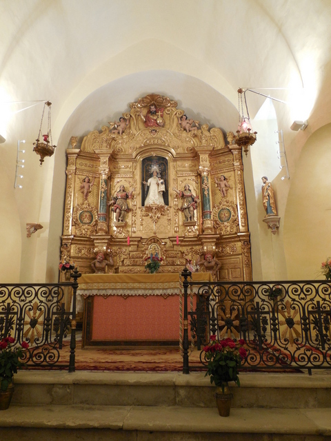 L’ornement principal de cette chapelle est son retable sculpté, doré et polychrome, belle réalisation de la deuxième moitié du XVIIIe s. qui occupe tout le fond de la nef, occultant l’abside romane. On ne connaît pas l’auteur du retable, mais sa dorure est documentée entre 1771 et 1776[8], ce qui place sa réalisation dans les années précédentes. Il comporte une seule niche centrale, qui abrite la statue de la Vierge (qui ne correspond plus, à ce qu’il semble, à celle vue par Louis Just en 1860), entourée de plusieurs figures d’anges et de nombreux ornements. Il est divisé en trois travées par des colonnes peintes en faux-marbre, portées par deux atlantes, ou esclaves, aux expressions peinées, qui encadrent les gradins d’un tabernacle monumental.
