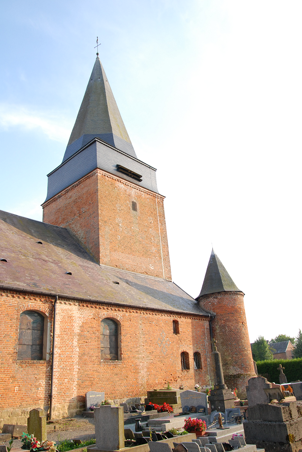 L’église, longue de 32 m, comporte un petit donjon de forme carrée haut et étroit.
