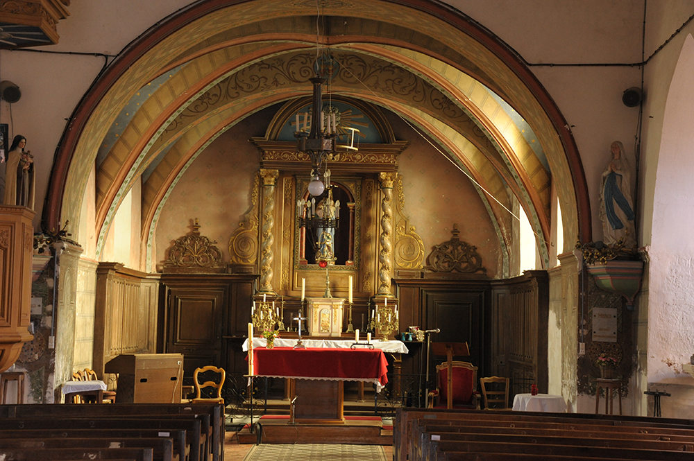 Les voûtes du choeur datent du 16ème siècle. Ce sont des motifs floraux (feuilles de lierre) et royaux (fleurs de Lys). Sa peinture date de 1899. La statue de la vierge et l’enfant est très bien conservée, un puit de lumière a été aménagé derrière elle pour donner l’illusion d’une auréole.