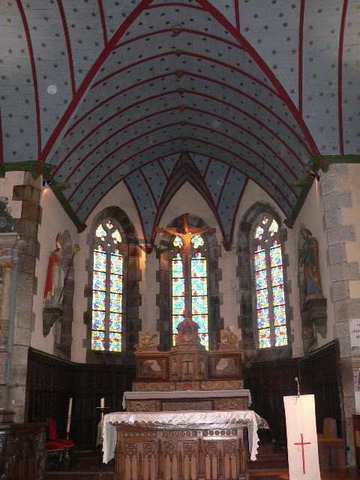 À l’intérieur, la nef, dite de « type obscur[4] », comporte quatre travées ; les arcades sont soutenues directement – sans chapiteaux – par des piliers octogonaux. Une tribune occupe le fond de la nef : on y accède par l’escalier du clocher. La charpente de la nef et du transept est maintenue par des entraits dont les extrémités sont sculptées en forme d’engoulants. La voûte, lambrissée, est recouverte d’une peinture bleue qui a fait disparaître récemment les étoiles dorées qui l’ornaient. Les sablières sont décorées de figures humaines, de même que les blochets aux quatre angles de la croisée du transept et deux de la nouvelle sacristie.