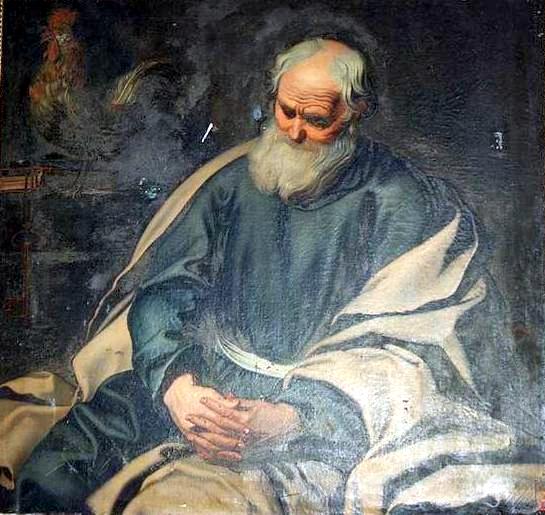 Il s’agit de la représentation du moment où saint Pierre, l’un des deux premiers disciples du Christ, se repent d’avoir renié le Christ. En effet, nous savons tous que le Christ fut trahi par Juda, mais nous savons moins qu’il le fut aussi, dans une moindre mesure cependant, par saint Pierre. Jésus le lui avait prédit : « En vérité je te dis, qu’en cette même nuit, avant que le coq ait chanté, tu me renieras trois fois »[1] . Et de fait, après l’arrestation du Christ, saint Pierre nia trois fois le connaître. Quand le coq chanta, saint Pierre, se rappelant les paroles du Christ, pleura amèrement. C’est la signification de la présence du coq sur le tableau : c’est le moment du repentir.