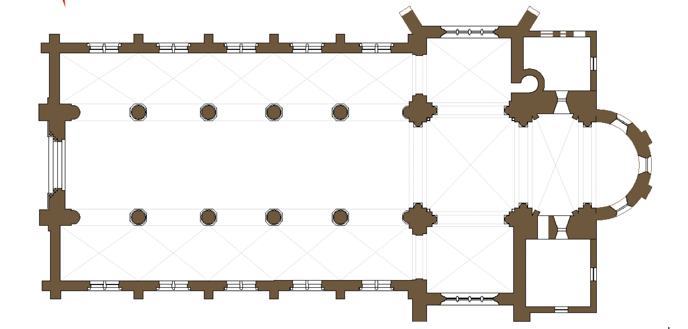 L’église actuelle est construite dès le XIIe siècle. De cette période nous reste l’abside, la travée droite du choeur, les murs Est des transepts, la travée du clocher et les murs gouttereaux de la nef.