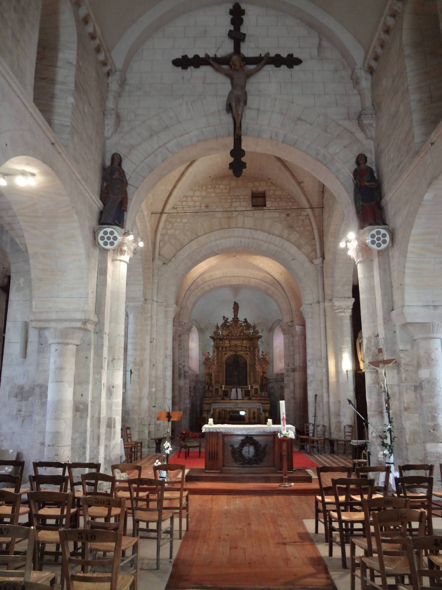 Le vaisseau central est couvert d’une voûte en berceau en plein cintre. L’arcature du vaisseau central, en plein cintre, est soutenue par des colonnes massives. Les bas-côtés sont voûtés d’arêtes et chaque travée est éclairée par deux ouvertures.