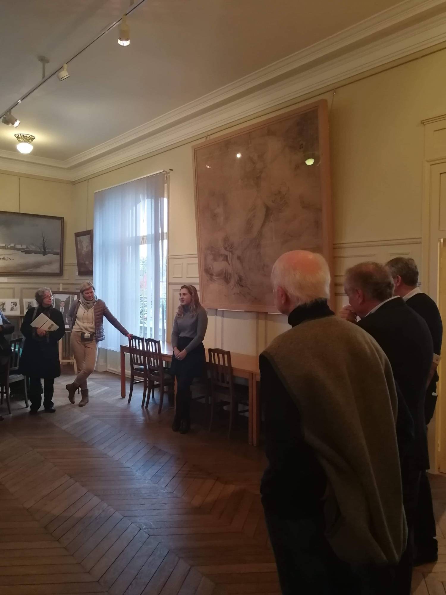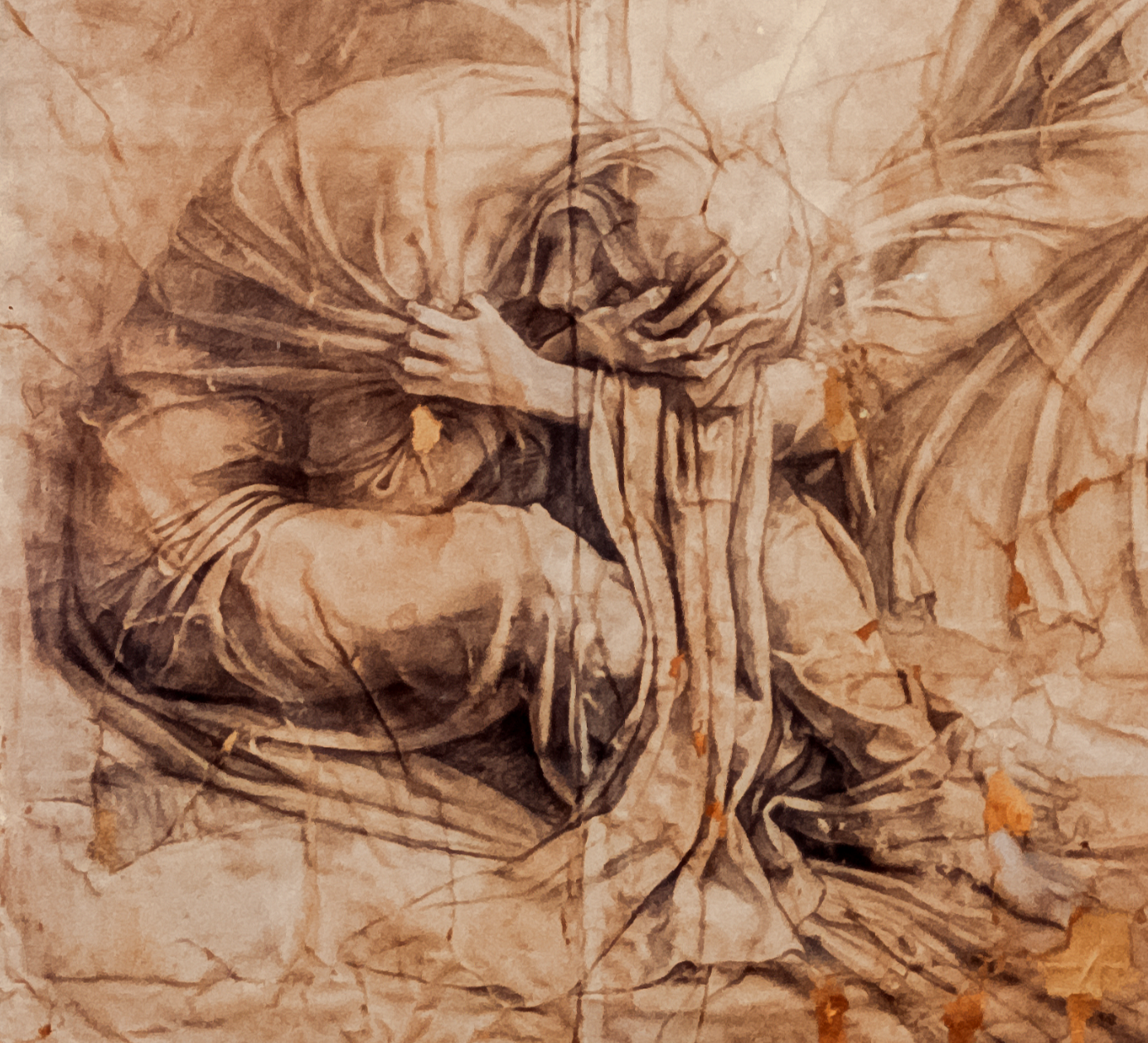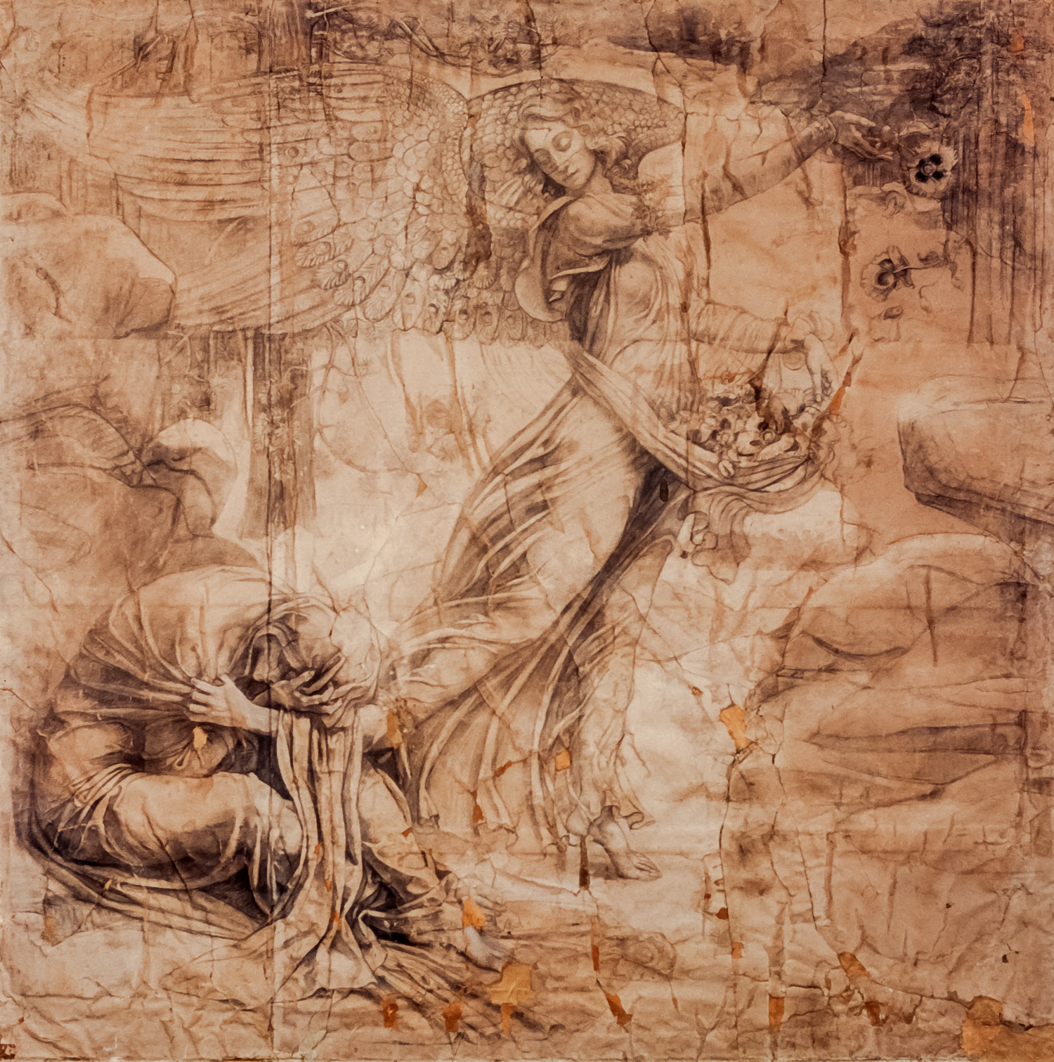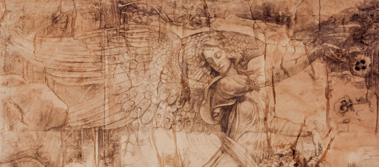 Mais l’état actuel de l’œuvre ne permet malheureusement pas d’en admirer les moindres détails ni de faire honneur à la finesse du dessin. Le calque est un support bien fragile que les années ont endommagé : papier oxydé voire déchiré à certains endroits, partie inférieure très abîmée et cadre non adapté sont autant d’éléments auxquels la restauration pourra remédier.