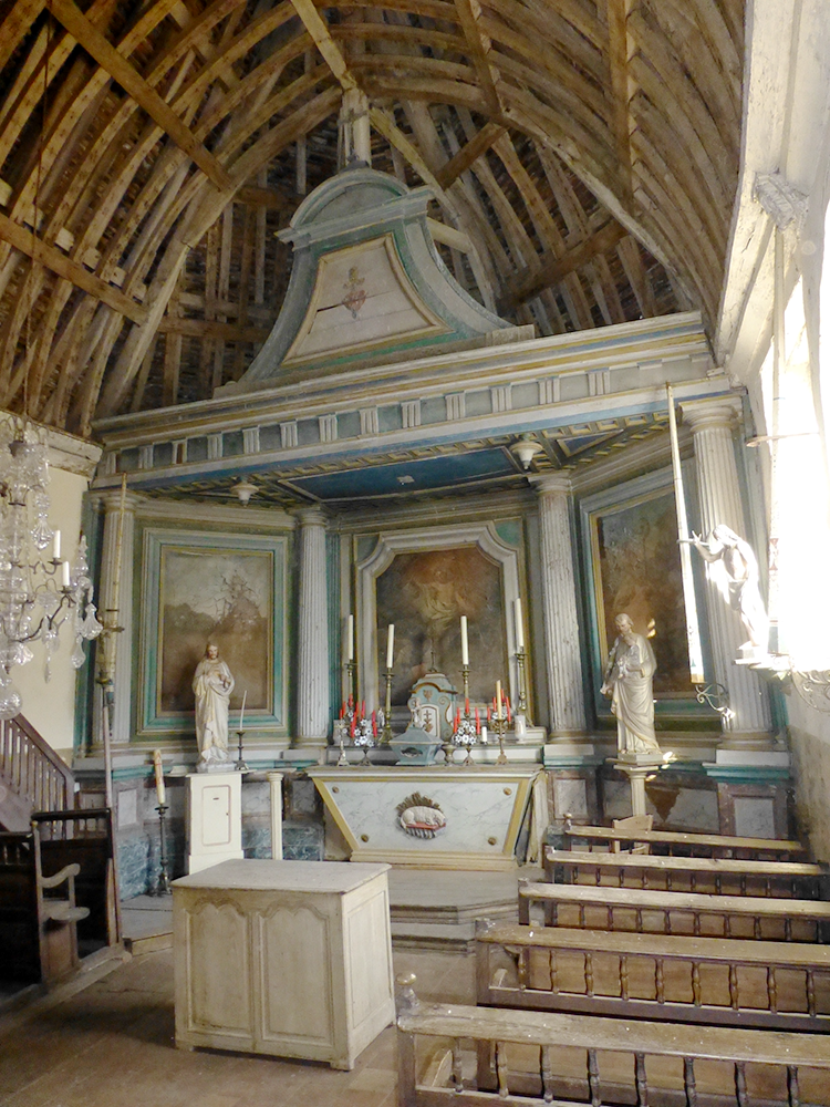 Un clocher avec une courte flèche d’ardoises, charpenté, sépare le volume de la nef par le milieu. Les murs de l’église sont en moellons de grès.