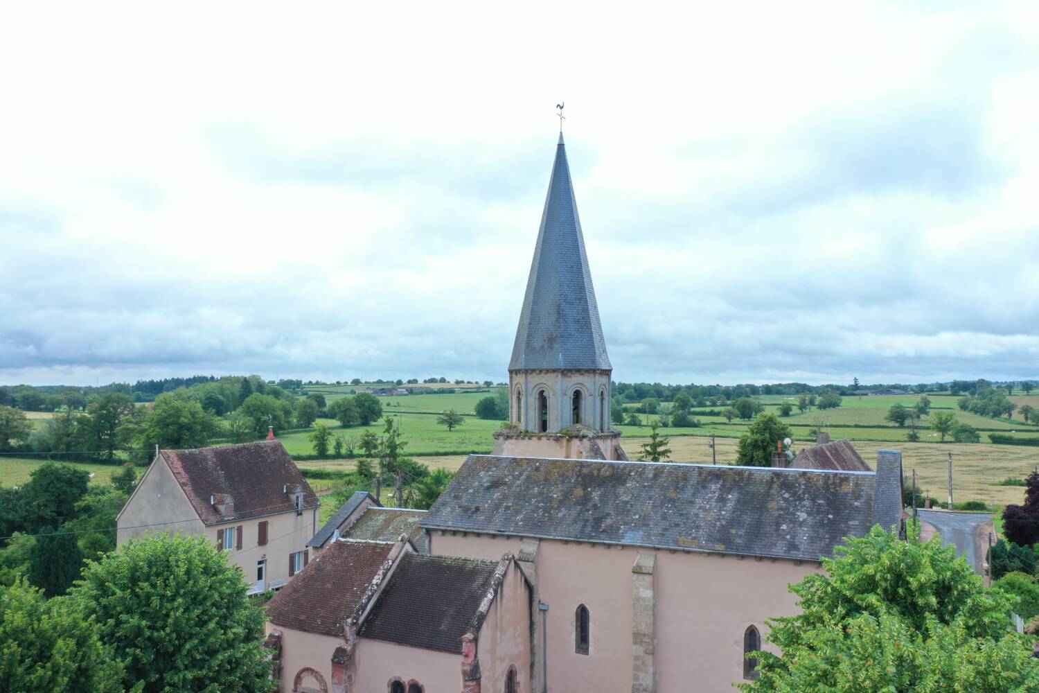 La partie la plus ancienne est le clocher, carré à sa base, octogonal à la hauteur des fenêtres. Il est surmonté par une élégante flèche en pierre. La façade est éclairée par trois fenêtres qui surplombent un porche rustique qu’on appelle en Bourbonnais un « caquetoire » ; cet abri couvert d’ardoise date du XVIe siècle.