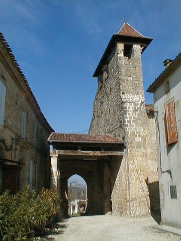 Un emban appuyé à la façade de l’église et reposant en vis-à-vis sur quatre colonnes dressées sur un banc de pierre sert en même temps d’abri à ceux qui entrent dans le « castelnau » par la porte fortifiée nord, perpendiculaire à l’église, selon une disposition retrouvée à Sainte-Mère.