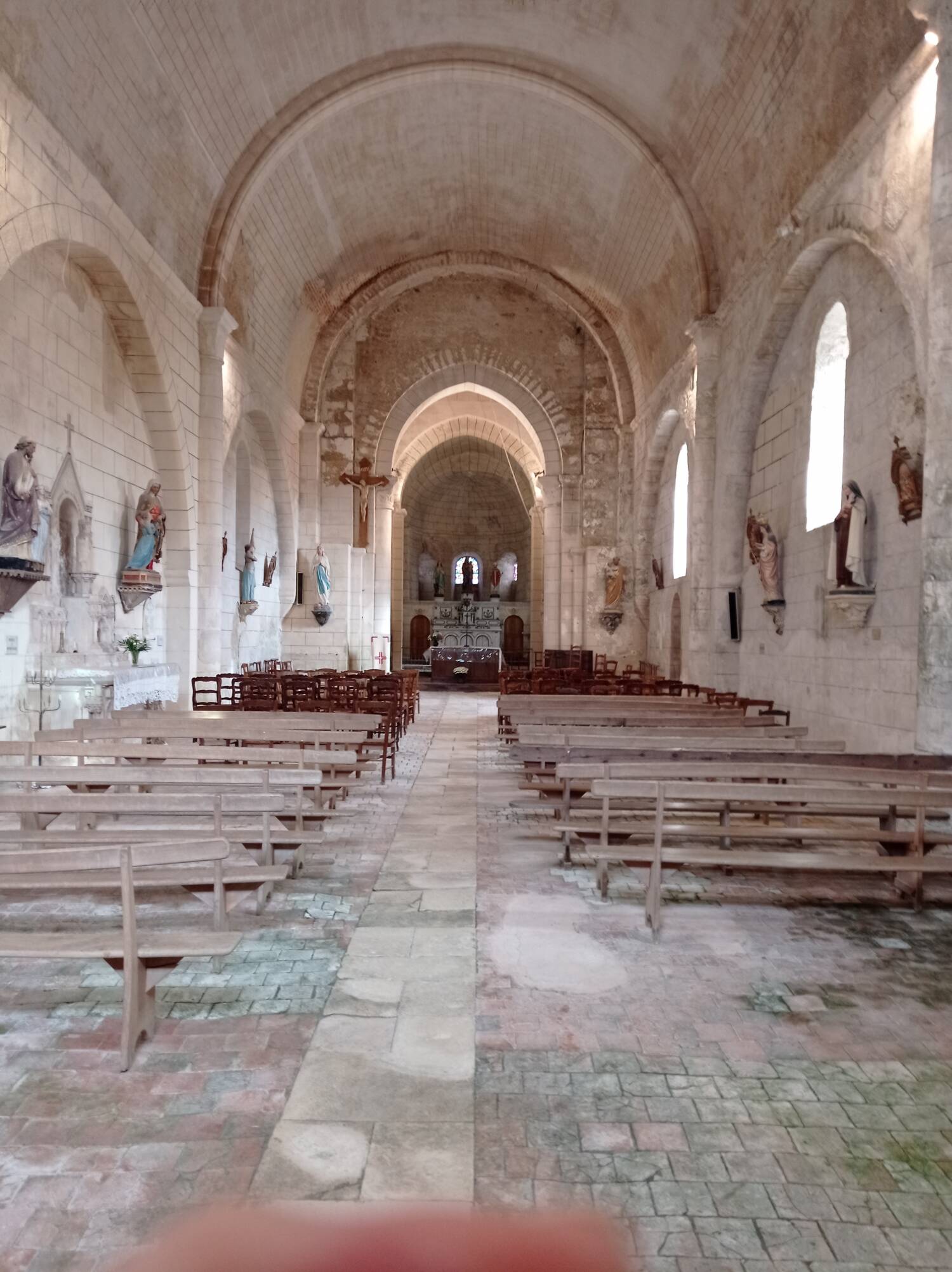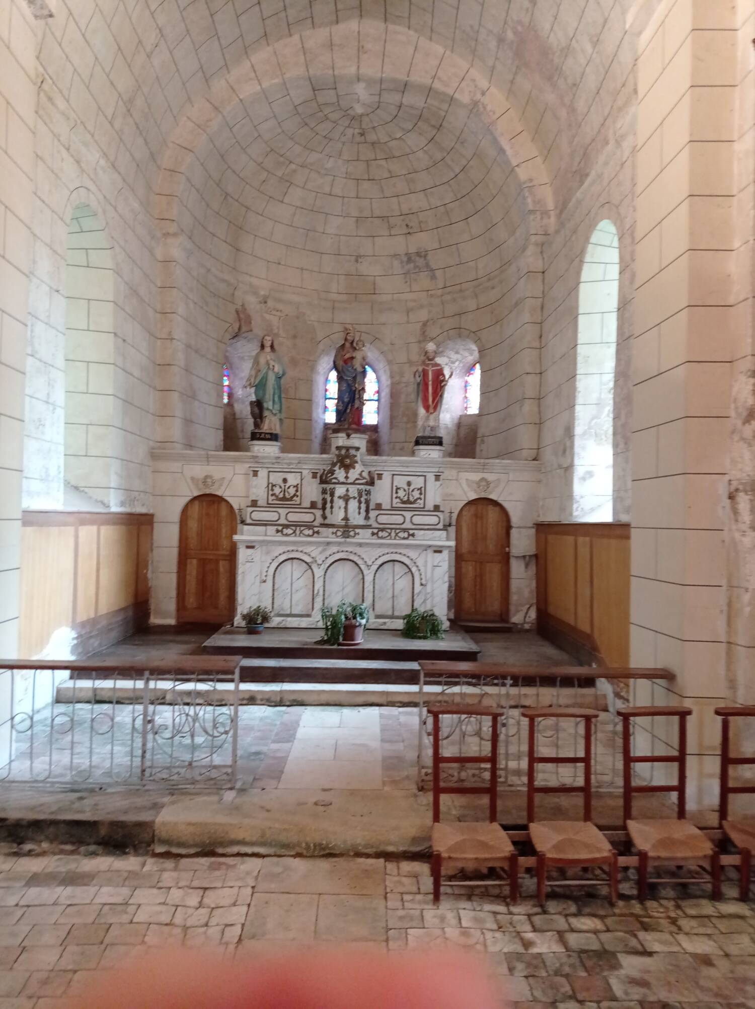 La croisée du transept est surmontée d’une coupole octogonale sur trompes, initialement éclairée par deux baies. La nef, dont la voûte en plein cintre a été refaite entre 1876 et 1878, est couverte d’un berceau brisé. L’élévation ouest est marquée par un portail polylobé, caractéristique de l’art limousin. Le clocher, rehaussé au XIXe siècle, présente une base ornée d’arcatures. Des surélévations des murs au-dessus des corniches indiquent l’existence d’anciennes chambres de défense, probablement ajoutées aux XVe ou XVIe siècles.