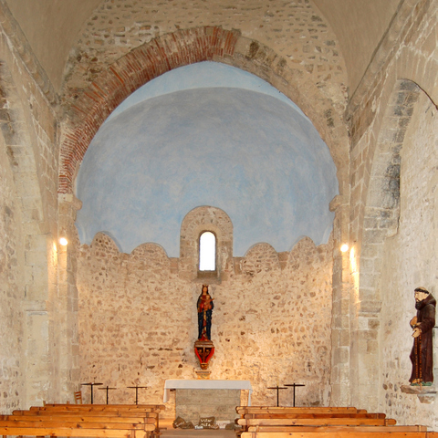 Telle que nous la voyons aujourd’hui, l’église porte tous les stigmates d’une histoire matérielle mouvementée, qui n’a pas, semble-t-il, été sérieusement étudiée[3]. La nef, notamment, simple vaisseau voûté, a subi un grand nombre de remaniements, discernables par les nombreuses strates de maçonneries de caractères différents repérables à l’extérieur sur son mur nord, dépourvu de toute ouverture. Peut-être certaines parties remontent-elles à l’époque pré-romane. L’abside est aussi épaulée par deux contreforts en briques, comme la façade ouest, signe d’une confortation rendue nécessaire par un épisode de destruction à l’époque moderne. La voûte de la nef est supposée ne remonter qu’au XIIIe s., du moins en raison de son profil en berceau brisé car, semble-t-il, effondrée, elle aurait été reconstruite dans les années 1950. Une étude menée selon les méthodes actuelles de l’archéologie du bâti s’imposerait pour établir toute la séquence des chronologies relatives. De multiples ruptures et remaniements peuvent être observés un peu partout.
