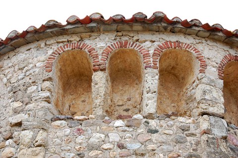 Le caractère le plus remarquable de cet édifice est son abside hémicirculaire, élevée et importante. À l’extérieur, elle est décorée en partie haute d’une suite de niches profondes, motif traditionnellement rapproché des caractères « lombards » du « premier art roman méridional », mais qui s’oppose à la si courante frise d’arcades plaquées peu saillantes, animant et rythmant le mur des absides et absidioles. Ici, les niches sont d’assez grandes dimensions, et profondes, produisant un effet d’ombre très puissant. C’est, en plus fruste, car les matériaux employés sont mixtes, briques, maçonnerie, enduit, le type que l’on rencontre dans les grands édifices de Cardona ou de Saint-Guilhem-le-Désert. Les niches sont soulignées en façade d’un arc en briques – sans doute matériau antique de remploi – qui retombe une fois sur trois sur une lésène en maçonnerie. La fenêtre d’axe appartient à ce parti décoratif, soulignée cependant par l’effet plastique inverse : elle s’ouvre sous une large voussure en enduit, claire, limitée par un petit cordon de briques à l’extrados de l’arc de la baie (détail typique de la première moitié du XIe s.) et par un cordon de pierres se raccordant sur les lésènes de part et d’autre. L’enduit est lisse, tandis que les parois de l’abside, faites d’une maçonnerie de galets peu travaillés, ont des joints couvrants soulignés par des traits de truelle simulant un faux appareil, détail également caractéristique du XIe siècle. Ces éléments sont d’une remarquable authenticité.