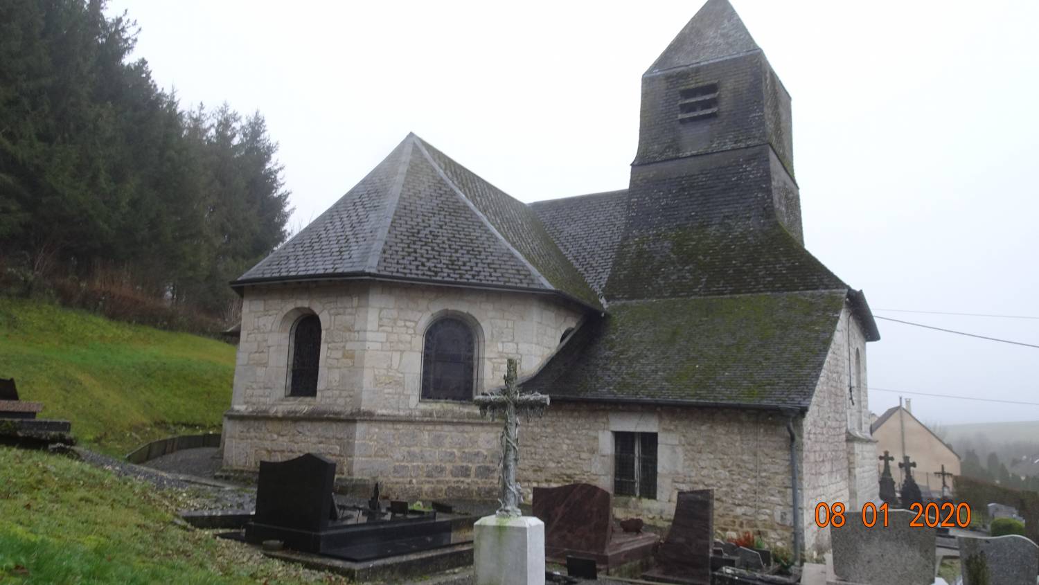 L’église actuelle date du XVIème et a subit de nombreuses transformations. L’église Saint-Remacle est implantée à la sortie ouest du village, à flanc de pente au coeur du cimetière. Elle est orientée nord-est. Elle présente un plan en croix latine. La nef à vaisseau unique est suivie par un transept saillant dont le bras nord supporte le clocher. Le choeur présente une travée droite et une abside à trois pans ; la sacristie est adossée au flanc nord de la travée droite du choeur. Les chaines d’angles, larmiers, baies et soubassements sont en pierre de taille de Logny-Bogny et le reste de l’édifice est en moellon de même nature.