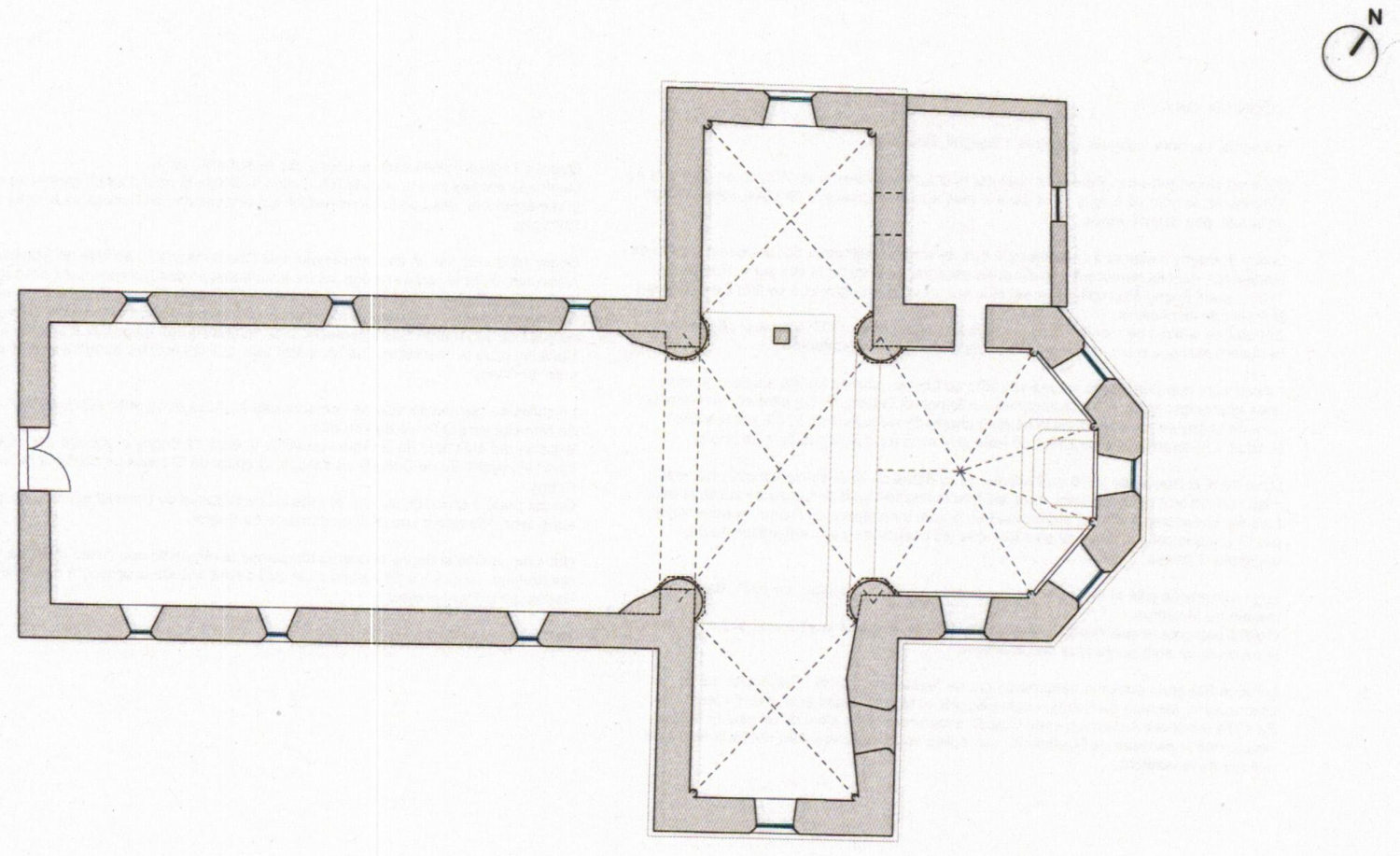 L’espace intérieur est entièrement plafonné et l’ensemble des surfaces intérieures est enduit. Le sol est pavé de carreaux de ciment multicolores. L’édifice ne comporte qu’un seul niveau percé de baies de petite à moyenne dimension. L’ensemble des couvertures de l’édifice est en ardoise. Le clocher comporte une chambre des cloches de plan carré surmontée par une flèche carrée peu élancée ; la nef, le transept et le choeur sont couverts par un toit à longs pans (le choeur se termine par une croupe polygonale).