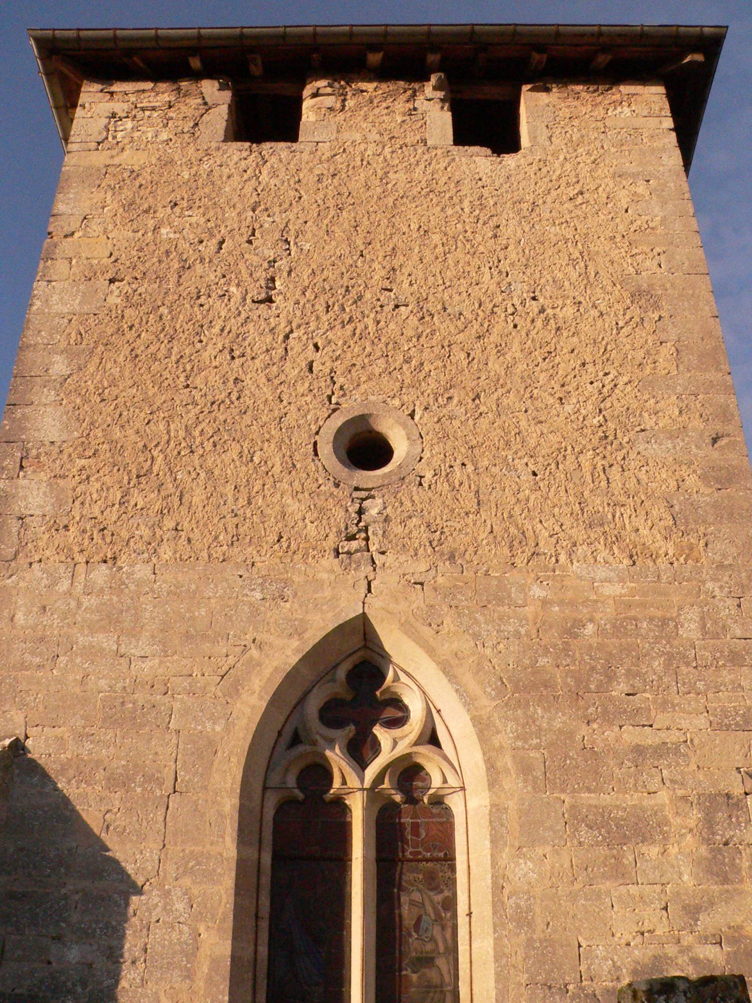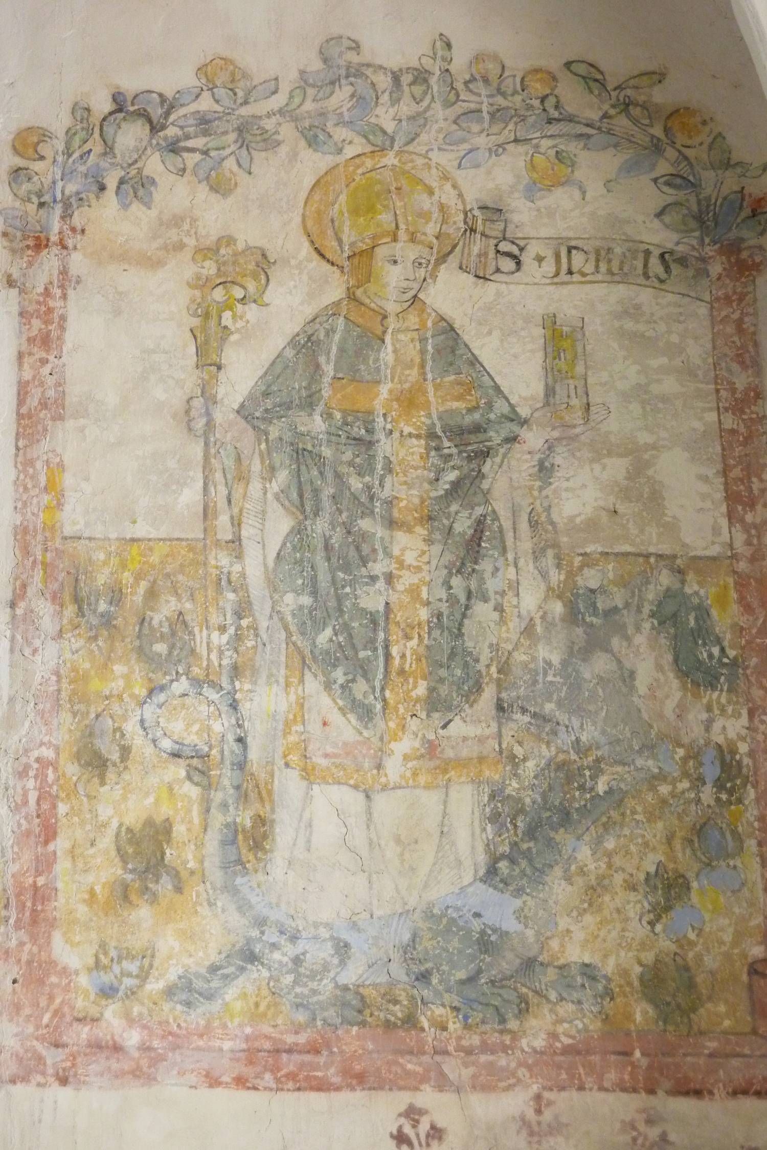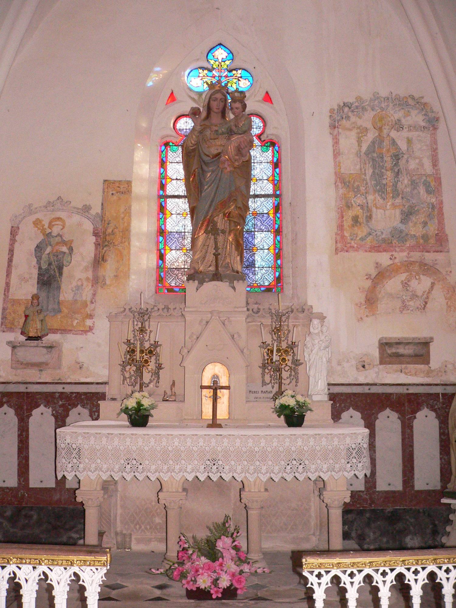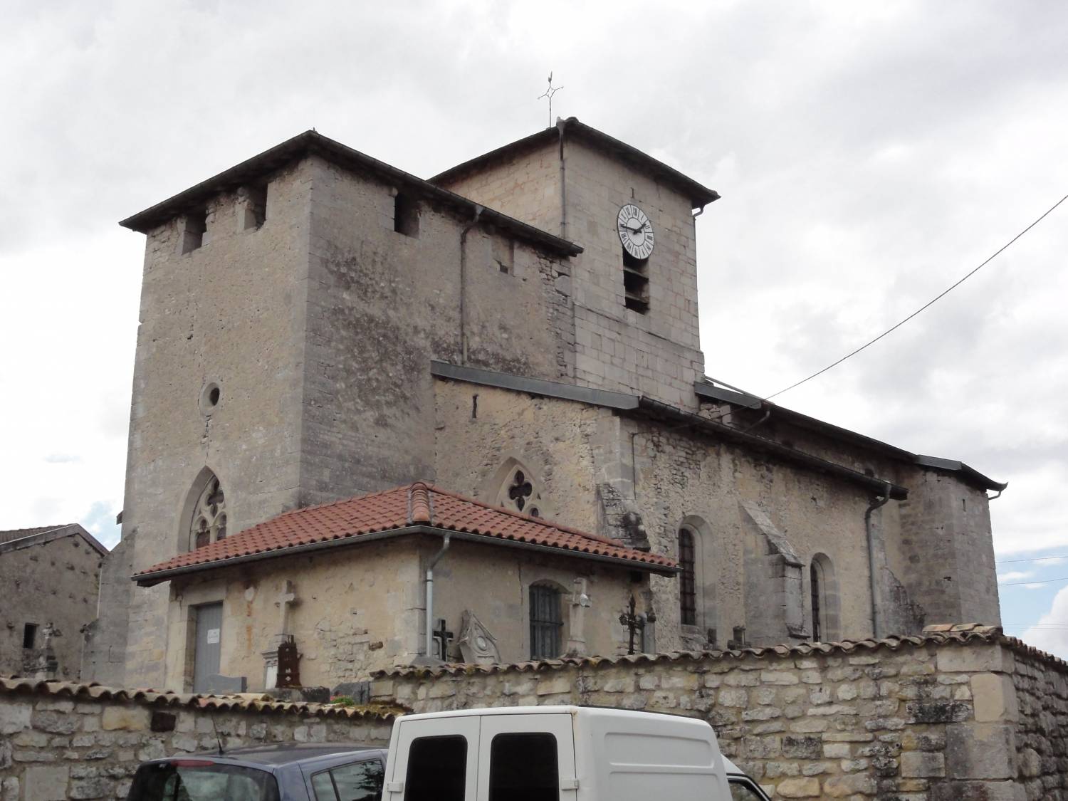Par ailleurs, l’église fut fortifiée en deux phases, la première au XVe s. et la seconde à la fin du XVIe s. et au début du XVIIe siècle. Elle conserve six fenêtres de tir munies de corbeaux pour mantelets, des meurtrières et des archères. Un escalier accolé au mur nord, communiquant directement avec la nef, permet aux habitants d’accéder aux deux salles de refuge où de belles peintures, datant de la fin du Moyen-Age, arborent les murs.