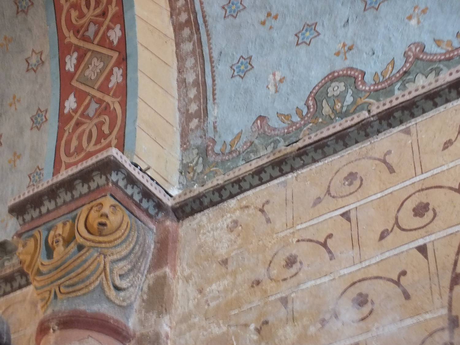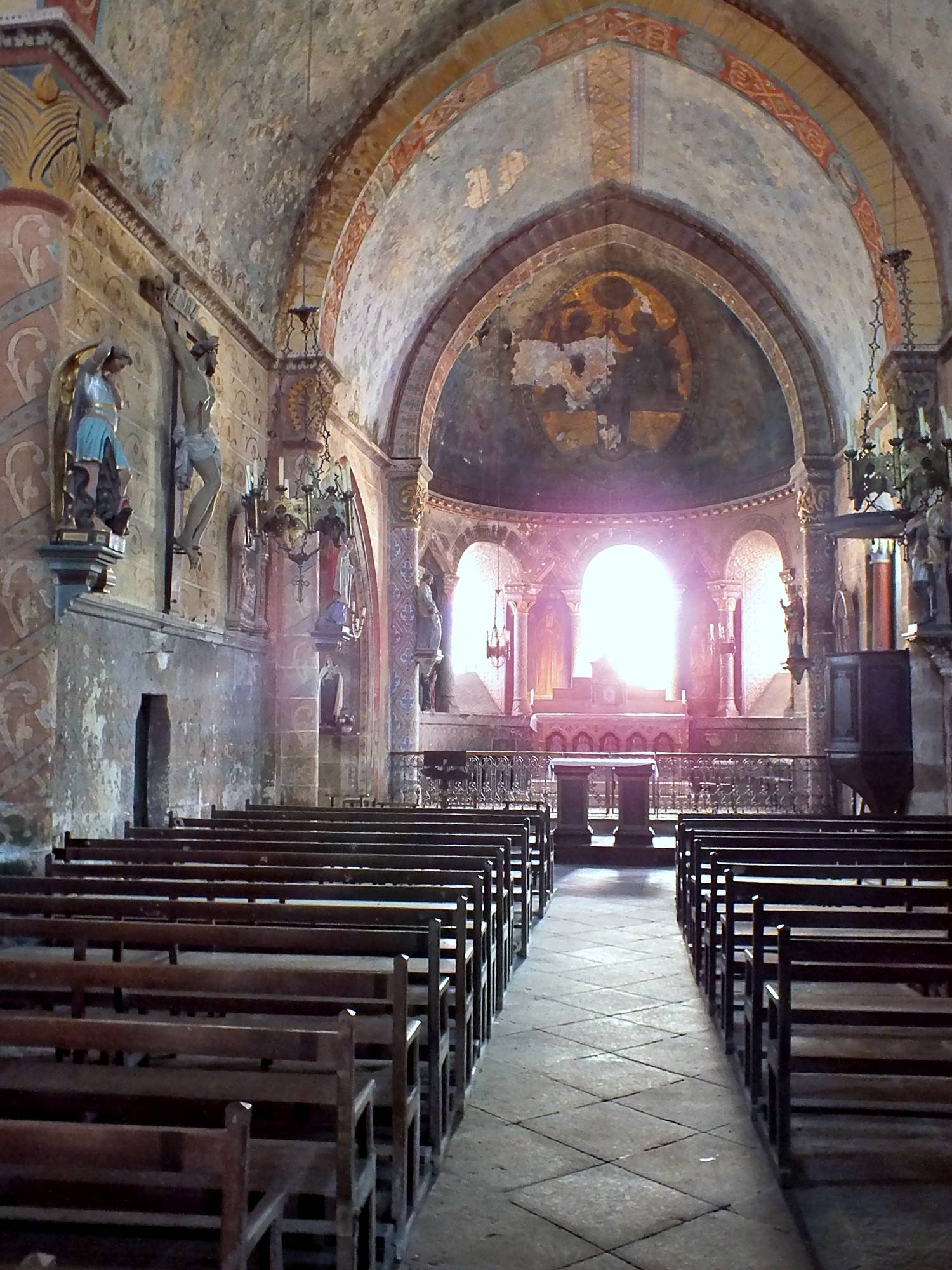 Elle est voûtée en berceau avec des arcs doubleaux reposant sur des colonnes à dosseret. L’abside romane est déportée à gauche, d’une façon très nette. Il s’agit d’une abside circulaire percée de trois ouvertures séparées par des arcatures en mitre, aveugles. Le clocher se compose d’un premier étage de couverture de plan carré et d’un second sur plan octogonal. Des modillons à copeaux ornent la corniche.