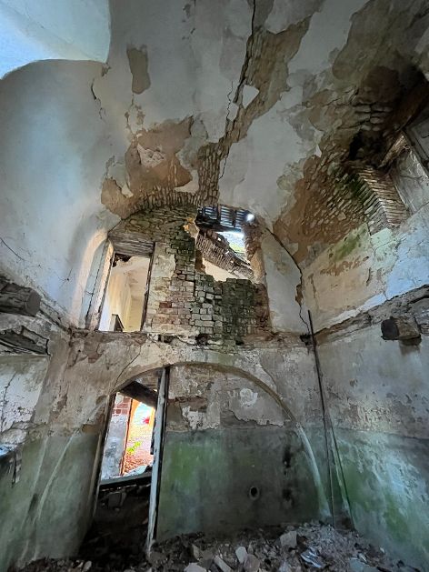 A l’intérieur, la chapelle est voûtée en berceau et semble avoir été composée de deux niveaux séparés par un plancher écroulé.