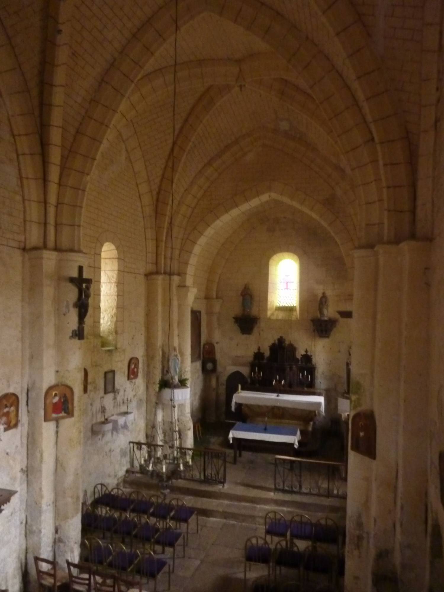 L’église de Lusignac est constituée d’une simple nef de trois travées, voûtées de croisées d’ogive. Le chœur à chevet plat est voûté en berceau brisé. Le clocher carré couvre la première travée et une partie de la seconde. Une bretèche surplombe le narthex. La sacristie a été bâtie sur le chevet à la fin du XIXème siècle.