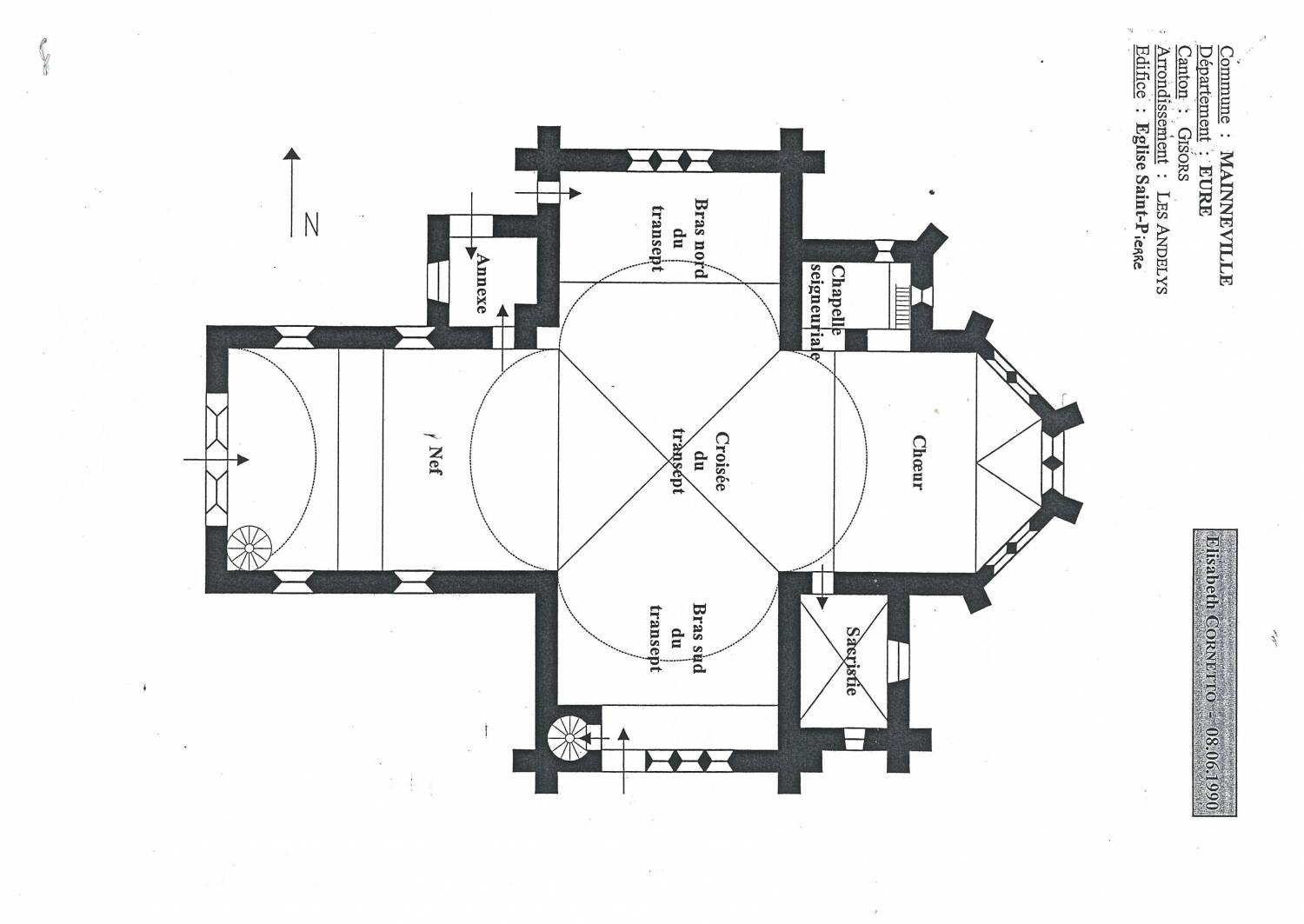 Le projet initial ne fut pas achevé et la nef en blocage ne fut pas reconstruite – on en voit juste l’amorce sur le mur nord – a été remaniée à de nombreuses reprises. Elle s’ouvre par une façade occidentale du début du xivie siècle en grande partie en briques, percée d’ une porte en plein cintre datée de 1701 et, au-dessus, de deux fenêtres jumelées en arc brisé. Les fenêtres latérales rectangulaires ont été percées en 1858-1859 lors des travaux entrepris pour le déplacement du cimetière. La nef fut couverte en ardoises en 1866 comme le reste de l’ édifice. Les croisillons et le chevet sont percés de larges baies cintrées à remplage Renaissance mais dont les moulures ne sont pas toutes achevées. Sur le modèle de la collégiale d’ Écouis, l’ intérieur a été couvert à l’ origine d’ une voûte en bois à berceau brisé dans la nef et à berceau cintré dans le reste du vaisseau, dont les entraits sont ornés de rageurs et les sablières de têtes humaines. Aux quatre coins de la croisée, sont représentés les symboles des quatre Évangélistes, dominés au sommet par un médaillon sculpté à l’ effigie de Dieu le Père. En 1896, le curé Dufour fit appliquer une nouvelle voûte en plâtre qui recouvrit la presque totalité de l’ ensemble. Sa suppression est aujourd’ hui en cours mais ne fait pas l’ unanimité. À droite du chœur, la sacristie voûtée en pierre sur croisées d’ ogives est éclairée par deux fenêtres cintrées. A gauche, la chapelle seigneuriale percée de deux baies de dimensions inégales et couverte d’ un berceau arrondi s’ ouvre sur le chœur par deux arcades cintrées s’ appuyant au centre sur une colonne dorique. Sous le chœur, une petite crypte cruciforme voûtée en berceau servait de caveau funéraire. Les fenêtres du chœur sont ornées de vitraux polychromes figurant saint Pierre, saint Paul, sainte Geneviève et saint Louis, exécutés par l’ atelier Roussel à Beauvais en 1890. Le mobilier classé est très riche ; il provient en partie de la chapelle du château de Mainneville détruite au xixe siècle, notamment les statues en pierre de Notre-Dame la Royale et de saint Louis, qui serait un portrait du roi. Elles sont placées dans la chapelle seigneuriale ; chefs-d’ œuvre du xive siècle, elles furent exécutées à la demande d’ Enguerrand de Marigny, né à Lyons-la-Forêt en 1260, seigneur de Mainneville, chambellan et ministre du roi Philippe le Bel. Une autre Vierge à l’ Enfant de la même époque représente Notre-Dame de Mainneville. Dans les bras du transept, deux retables sont l’œ uvre du sculpteur gisortien Duchesne (vers 1766).