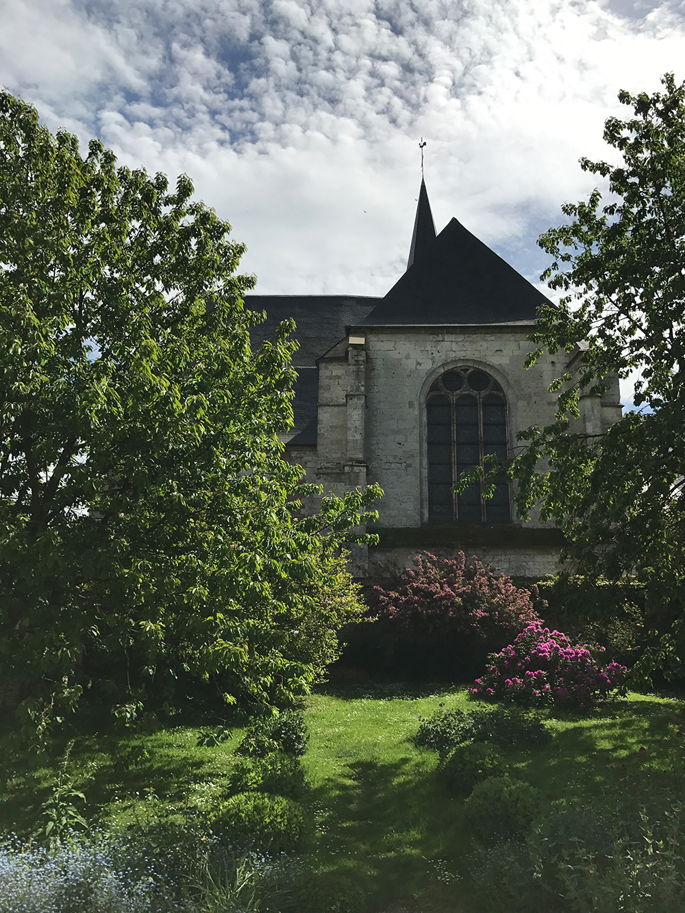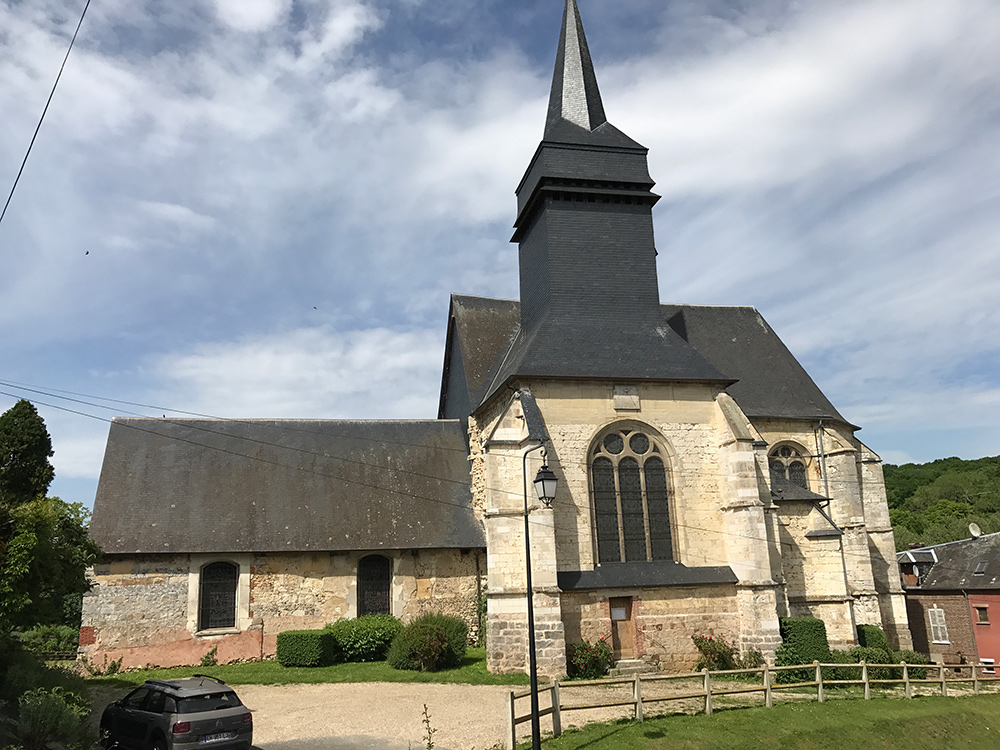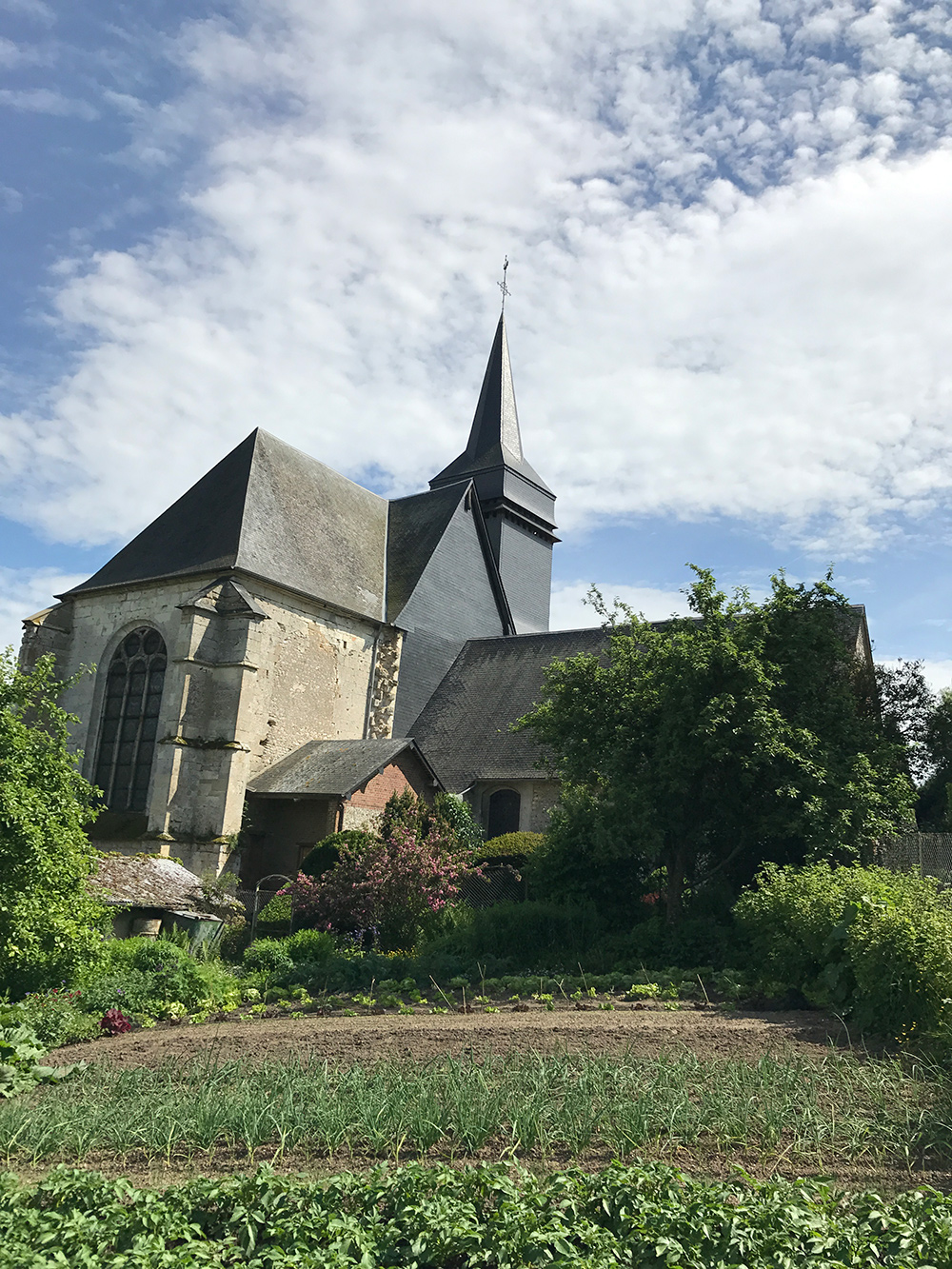 Edifiée à mi-versant sur une terrasse qui domine le village, l’église Saint-Pierre-et-Saint-Paul, placée sous le patronage des seigneurs de Mainneville dont le château s’élève non loin de là, remonte à la période romane. En forme de croix latine et d’une longueur de trente-huit mètres, elle présente une nef à vaisseau unique qui conserve des traces de baies de la construction d’origine. Un transept et un chœur à chevet à trois pans beaucoup plus élevés ont été reconstruits au XVIe siècle en pierre calcaire sur soubassements de grès avec des contreforts saillants. Un jambage intérieur de la grande fenêtre du croisillon nord conserve la date de 1559. Au nord du chœur, la chapelle seigneuriale rectangulaire est ornée à l’extérieur d’un bel appareil de briques disposées en arêtes de poisson, traversé d’un bandeau de pierre. Elle pourrait être antérieure à la reconstruction. Au sud, une sacristie carrée complète l’ensemble qui acquiert ainsi toute sa monumentalité, encore renforcée par le clocher massif à flèche octogonale en ardoise qui surmonte le bras du transept.