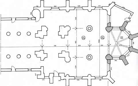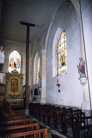 La nef romane très simple, plus élevée que ses bas-côtés, est aujourd’hui éclairée indirectement par des fenêtres en plein cintre disposées irrégulièrement dans les murs goutterots. Des traces d’ouvertures dans la partie haute de la nef laissent à penser qu’à l’origine elle était éclairée directement par des fenêtres hautes. Dans le mur sud s’ouvre une petite porte surbaissée surmontée d’un linteau en pierre, émergeant de l’enduit qui recouvre l’ensemble des murs de la nef. La façade ouest, contrebutée par deux contreforts, est percée d’une porte moderne en arc brisé, simplement soulignée de claveaux apparents. Elle est surmontée d’une fenêtre en plein cintre et d’un oculus ouvert dans le pignon. La partie haute du clocher, remaniée à l’époque classique, se termine par une petite flèche en charpente. Une tour ronde d’escalier, correspondant à la campagne de travaux du XVIe s., permet d’accéder à la charpente du transept. Elle est adossée au grand contrefort d’angle nord entre la nef et le transept et couronnée par un toit en poivrière. Le transept, épaulé par de gros contreforts dont certains datent des années 1860, lorsque l’enlèvement des terres du cimetière a désorganisé les maçonneries de l’édifice, s’apparente aux transepts doubles des églises auboises du XVIe s. : des pignons contigus à raison d’un pignon par travée. Ici, s’il y a bien trois pignons du côté nord, au sud la présence de vestiges du transept roman, qui occupe la première travée sud du transept, n’a permis la construction que de deux pignons. Chaque travée de chœur est percée d’une fenêtre en arc brisé dont les remplages d’origine ont disparu lors de l’effondrement des voûtes du chœur et de l’abside à la fin du XVIIIe siècle. Deux autres baies complètent l’éclairage du chœur à l’est. L’édifice se termine par une abside à cinq pans dont les ouvertures sont identiques à celles du chœur. La corniche à modillons continus qui court sous la couverture de la tourelle de l’escalier, des façades est du chœur et du chevet est la seule décoration extérieure de l’église du XVIe siècle. Ce type de décor est courant à cette époque dans la région et on le rencontre dans un grand nombre d’églises, comme à Pouan, Polisot, Auzon-les-Marais ou Gélannes entre autres. Les murs de la construction du XVIe s. sont constitués de moellons jusqu’au niveau des assises des fenêtres, la partie supérieure est en maçonnerie appareillée. La nef composée de quatre travées communique avec les bas-côtés par de grandes arcades en plein cintre qui reposaient primitivement sur des piliers carrés, aujourd’hui englobés dans de grossiers massifs cylindriques peu élevés.