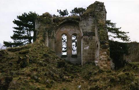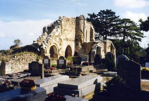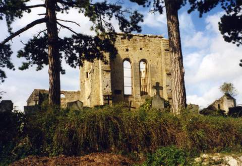 Ruines de l’ancienne église. Au Moyen-Âge le village de Maizy s’était développé sur le rebord du plateau dominant la rivière, à proximité d’ un château aujourd’hui disparu; il possédait une église paroissiale dédiée à saint Martin qui dépendait du chapitre de Laon. Le village s’est peu à peu reconstruit au fond de la vallée, au bord de la rivière, laissant l’église Saint-Martin isolée sur son promontoire et entourée du cimetière toujours utilisé. Après la première guerre mondiale, l’église était demeurée presque intacte, mais, au cours des combats sur l’Aisne de mai-juin 1940, les charpentes et couvertures furent entièrement détruites et ne furent pas reconstruites. Le monument est maintenant à l’état de ruines, mais laisse encore apparaître l’ensemble de sa structure où se révèlent deux parties distinctes : la nef romane et les parties orientales gothiques. La nef à collatéraux, longue de cinq travées, présente les caractéristiques habituelles des monuments romans de la région : de grandes arcades plein cintre à double rouleau et à arêtes vives reposant sur des piles rectangulaires à imposte chanfreinée. Cet ensemble peut dater de la fin du XIe, ou du début du XIIe s., mais la façade occidentale a été dotée ultérieurement d’un portail encadré d’une série de moulures en arc brisé. Les parties orientales, moins homogènes, ont sans doute été modifiées à plusieurs reprises. Au-dessus de la première travée de chœur se dressait un solide clocher de plan carré muni d’une tourelle d’escalier toujours en place sur le flanc sud. Le clocher communiquait avec deux chapelles basses formant transept, comme en témoignent des arrachements encore visibles sur les murs latéraux ; le chœur rectangulaire était fermé par un chevet plat. Cette formule du transept bas est plutôt romane et date probablement de l’édifice d’origine, mais les vestiges des ogives, des supports, des arcs d’encadrements et des fenêtres montrent que la croisée, les chapelles et le chœur ont été voûtés à l’époque gothique . Les ogives sont formées de deux tores séparés par un filet et reposent sur des chapiteaux à crochets et des colonnettes. Les arcs doubleaux comme les formerets sont soulignés d’une moulure torique. Toutes ces caractéristiques permettent de dater le voûtement de la fin du XIIe s. ou du début du XIIIe siècle. Les deux lancettes latérales du chœur entourées d’une double rangée de claveaux chanfreinés, sont aussi typiques de cette période. De même, le décor de la fenêtre latérale qui éclaire la chapelle sud est toujours en place ; il rappelle un type d’encadrement fréquent en Soissonnais à la même période : un tore soulignant l’archivolte qui repose sur deux petits chapiteaux et deux colonnettes. D’autres modifications sont intervenues, notamment dans le chœur où une ancienne inscription, qui a disparu avec l’arasement des maçonneries, précisait qu’une réfection avait eu lieu en 1660. C’est peut-être à cette époque qu’il faut attribuer les deux lancettes géminées, sans décor et sans caractère bien défini, qui éclairent le chevet plat. La chapelle sud aurait également été transformée en chapelle seigneuriale à une période indéterminée. La commune de Maizy a souhaité conserver les ruines de l’église et les mettre en valeur pour commémorer les combats de 1940. La Sauvegarde de l’Art français a décidé d’accorder une subvention de 16 000 F en 1998 pour la mise en sécurité de ces vestiges architecturaux.