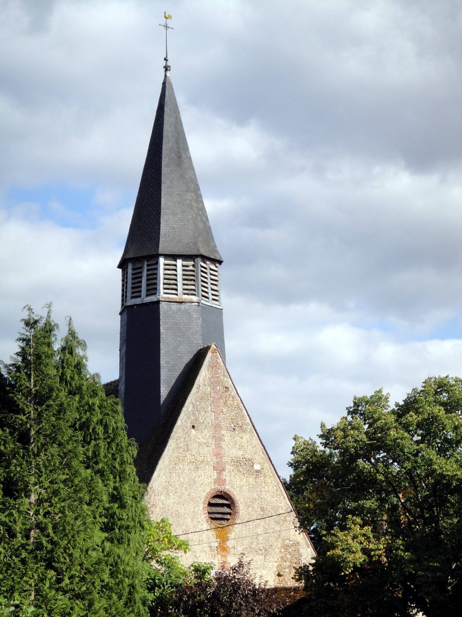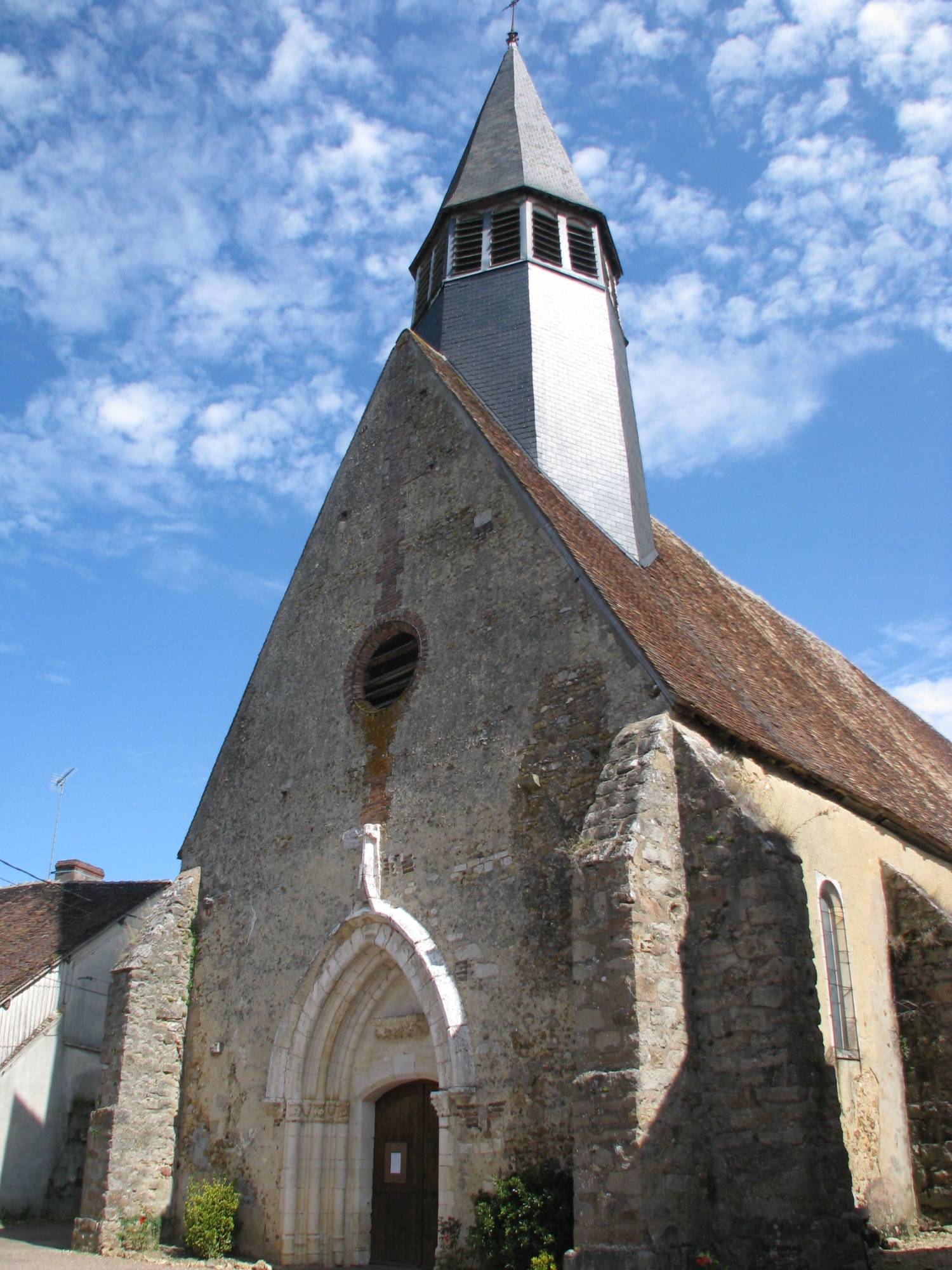 Une imposante poutre de gloire marque la séparation entre la nef et le sanctuaire ; elle supporte trois statues, peut-être contemporaines de la construction de l’édifice. Plusieurs interventions ultérieures ont modifié quelque peu le parti primitif, les plus importantes remontant au XIXe siècle. Outre le renouvellement du mobilier liturgique et l’ajout de peintures murales, on dota alors la façade d’un portail flamboyant qui provient de l’abbaye de Fontainejean. Le monument renferme encore plusieurs statues anciennes ainsi que des œuvres en bois sculpté du XVIIIe siècle.