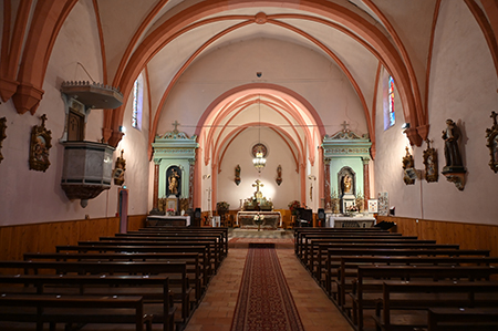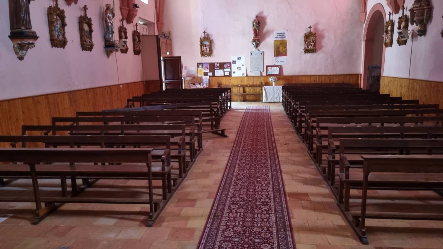 Son architecture, notamment sur la façade donnant sur la place, révèle encore les anciennes fenêtres et rosaces, partiellement masquées par les contreforts érigés pour prévenir l’effondrement des murs. Côté sud, la façade est sobre, presque austère, contrastant avec l’intérieur où les voûtes en plein cintre rappellent l’influence romane. Au nord de l’édifice, se trouve l’ancien cimetière, aujourd’hui désaffecté depuis plusieurs siècles. Sur le campanile, un clocheton abrite l’horloge du village.