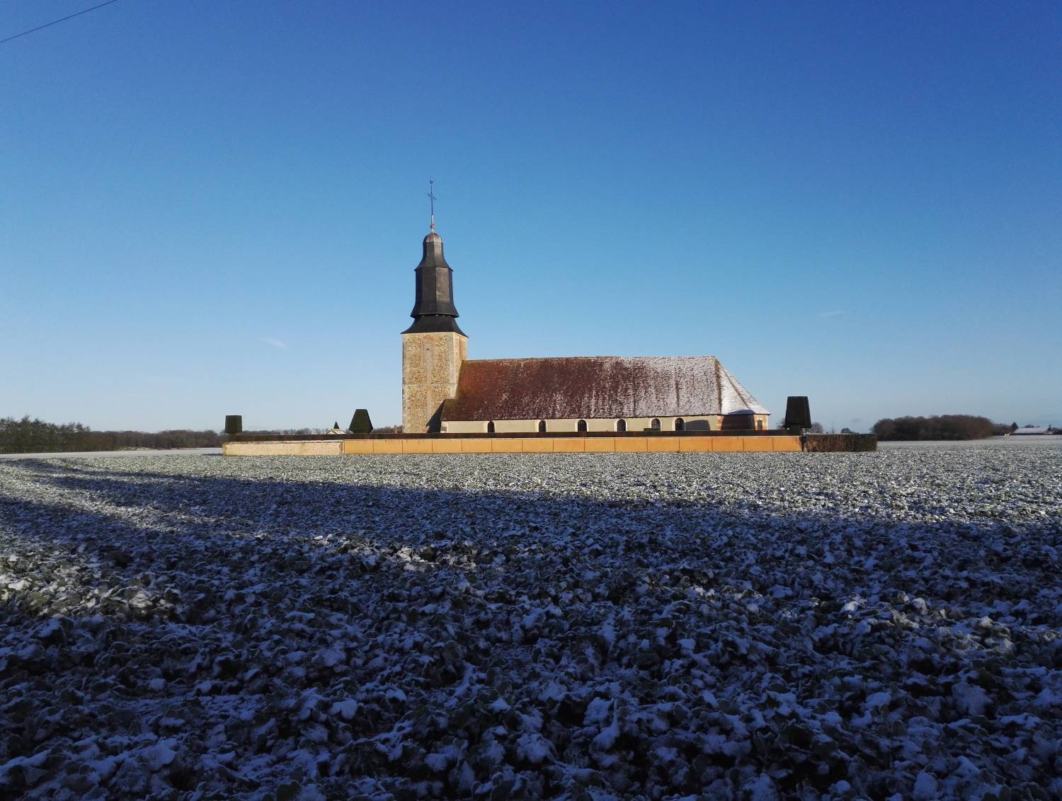 L’église actuelle fut rebâtie sur ces ruines en pierre et en chaux grâce aux libéralités du Chevalier Gislebert des Essarts, à la fin du XIIIe siècle. Par la suite, l’église fût refaite en grande partie au XVIe siècle. Durant la période contemporaine, l’église a subi plusieurs dommages dus à des événements climatiques comme la tornade de 1956 qui souffla les vitraux, la tempêtes de 1999 qui mit en péril une partie de la toiture mais aussi à des incendies en 1980, qui imposèrent la restauration du clocher.