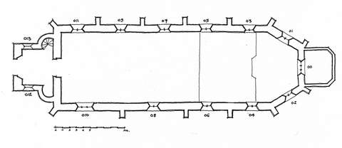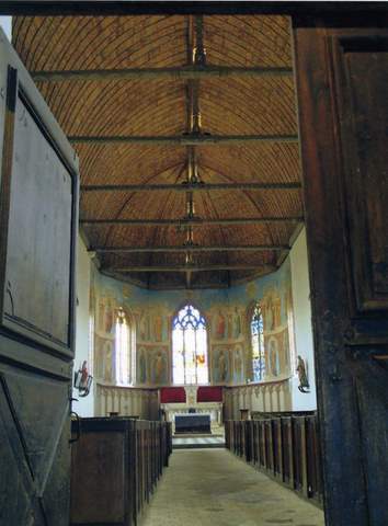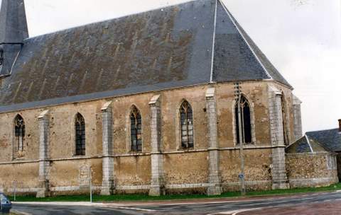 L’église paroissiale de Marchéville, dédiée à saint Chéron, attire le regard par son volume imposant. Précédé d’un clocherporche avec tourelles d’angle, le vaste vaisseau, repris au début du XVIe s., englobe dans une même campagne de travaux la nef et le chœur. De plan très simple, sans collatéral ni transept, l’édifice se termine par une abside à trois pans avec sacristie d’axe.. A l’extérieur, l’harmonie qui s’en dégage tient à son unité de style et à la régularité de sa composition : alternance rythmée des douze hautes fenêtres à remplage flamboyant avec des contreforts élevés dont le bord supérieur des glacis vient s’arrêter au niveau de la corniche. Un larmier court le long des façades, à la base des fenêtres et autour des contreforts . Les dessins des remplages ne sont pas tous identiques. Une légère hésitation dans le parti architectural est à l’origine de la réalisation d’une baie plus large et plus élevée que les autres, sur la façade sud qui compte quatre b ies, par opposition à la façade nord où elles sont au nombre de cinq. A l’intérieur, l’œil est attiré par le volume de la belle voûte lambrissée, dont le décor peint présente, dans un décor végétal, une alternance de colombes et de fleurs stylisées. Selon l’indication portée sur un entrait ouvragé, ce travail daterait de 1536 ; la charpente elle-même est sculptée et décorée. Le décor polychrome a vraisemblablement été restauré au XIXe s. au moment des peintures du chœur : en 1854, lors de son passage dans la commune, l’agent-voyer cantonal de Chartres signale le mauvais état du « lambris en bois de chêne de la voûte » ; « la destruction d’une partie du lambris qui, aujourd’hui, a besoin d’urgences réparations » s’explique par « le mauvais état de la couverture en tuile (sic) de l’ église ». C’est donc après 1854 que la couvert ure actuelle d’ardoises fut substituée à la couverture de tuiles. Des fragments de vitraux du XVIe s., présents dans la baie nord du chœur, sont classés Monuments historiques. Le mauvais état des baies – déjà le rapport de 1854 signalait qu’elles étaient murées sur leur tiers – imposait une restauration rapide. La Sauvegarde de l’Art Français a octroyé en 1994 une aide de 34 000 F pour la réfection de trois baies sur le flanc sud de cette église non protégée.