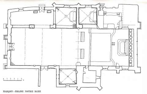 L’église paroissiale de Marçon, qui fut très tôt placée sous le patronage de la Vierge, est dédiée à Notre-Dame. Des campagnes de construction successives ont modifié une structure d’origine romane, à ouverture latérale sud. Le plan intérieur est très simple : un portail occidental en arc brisé, dont l’arcade était autrefois ornée de sculptures, ouvre sur une nef rectangulaire, agrandie d’un seul collatéral, côté nord, et terminée par un chœur à chevet plat. Le collatéral est séparé de la nef par des arcades en plein cintre et une arcade en arc brisé ; deux d’entre elles sont décorées d’un ange sculpté. Sur le fond du chœur ont été incorporées des colonnes ioniennes cannelées entre lesquelles sont placées des statues. Les fenêtres en plein cintre, en arc brisé ou garnies de remplages flamboyants attestent des diverses campagnes de construction. Sur la façade sud s’élève un intéressant clocher datant du xve s. Les contreforts à ressaut qui le cantonnent sont surmontés de pinacles en pierre de tuffeau qui encadrent une flèche en charpente couverte d’ardoises. Une corniche en pierre, ornée de modillons sculptés de figures humaines, ceinture cette tour.Après une campagne de restauration sur la façade, des travaux très urgents sont apparus nécessaires sur la charpente et la couverture du clocher ; à cette occasion, les quatre pinacles de pierre ont été remis en état et les figures grotesques de la corniche nettoyées. Dans cette seconde campagne sur cet édifice inscrit à l’inventaire supplémentaire des Monuments historiques, la Sauvegarde de l’Art français est intervenue pour 60 000 F en 1987.