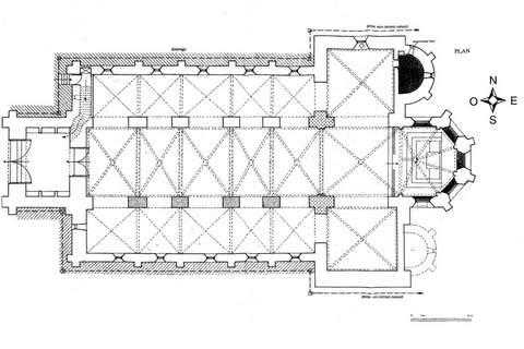 Le plan de l’édifice à première vue est simple : un imposant clocher-porche précède une nef entre deux bas-côtés de cinq travées, suivis d’un transept ouvert sur un chevet pentagonal et deux absidioles dont l’une a disparu au milieu du XXe siècle.