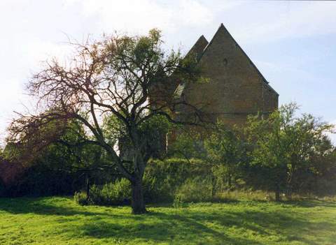 Si le chœur de l’église est moderne, la nef présente encore la plupart de ses dispositions d’origine : c’est une vaste salle plafonnée, dont l’infrastructure est en grès, les parties supérieures en brique avec compositions décoratives géométriques et cruciformes en brigues vernissées. Les fenêtres d’origine, en arc brisé, étaient percées immédiatement sous le toit. Elles ont été obturées et remplacées au XIXème s. par de grandes fenêtres cintrées, qui renforcent l’aspect profane de cette église dépourvue de clocher. Sur la façade occidentale s’ouvre l’unique accès de l’église avec son portail en arc brisé sous une petite anse; deux puissantes tourelles d’angle reposant sur des contreforts cruciformes en surveillent l’entrée. Ici, le grès domine largement, à l’ exception de la partie supérieure des tourelles et du pignon, par ailleurs refait en briques.