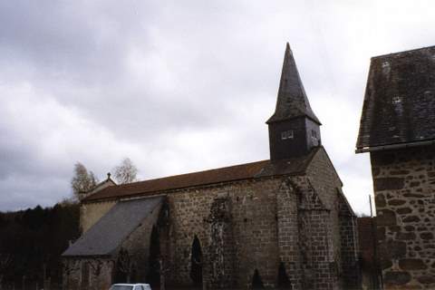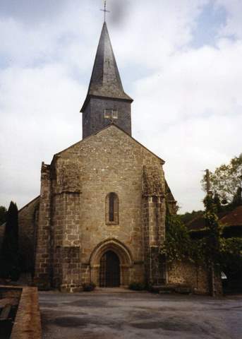 Le portail en cintre brisé et la jolie baie en plein cintre percée dans son axe paraissent écrasés par un pignon trop haut, qui a été remonté. En outre, on a préféré, comme souvent au XIXe s., élever au-dessus de la première travée un clocher en charpente. Le portail présente les caractères spécifiques de la région : ses voussures sont garnies de gros tores dégagés dans des scoties qui se prolongent par des colonnettes ; entre eux s’interposent des blocs de chapiteaux-frises, sculptés de feuillages et de masques humains. Dans la sacristie moderne, on remarque un linteau de porte avec un arc en accolade et un petit écusson.