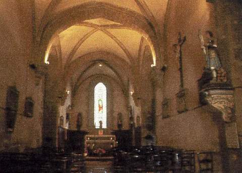 Elle se compose d’une nef unique de trois travées et d’un chœur terminé par un mur droit (longueur totale 32 m). Le chœur éclairé par une grande fenêtre centrale et les chapelles accolées au nord et au sud sont des amplifications du XIXe s. dotées de vitraux néo-gothiques. Mais la nef remonte au XIIIe siècle. Elle était couverte à l’origine d’une voûte en berceau brisé si l’on en juge par le tracé des arcs doubleaux actuels. Ceux-ci retombent sur des piliers à simple imposte chanfreinée. À la suite de dégâts faciles à deviner, ce voûtement a été remplacé au XVe s. par des croisées d’ogives reçues par des consoles sculptées.