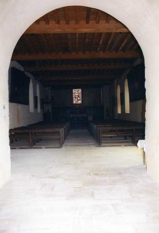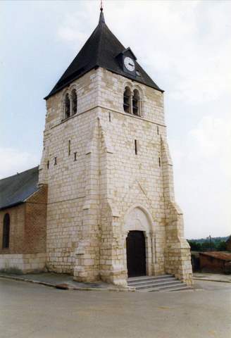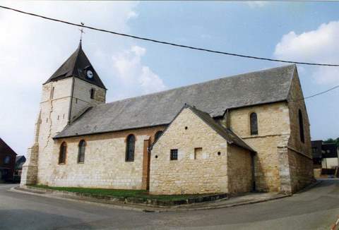 L’église de Martigny est un édifice au plan fort simple. Il se compose d’un clocher-porche précédant une nef unique terminée par un chœur à chevet plat légèrement plus étroit que la nef. Si le plan de l’ édifice et les volumes semblent dater de la fin du XIIe ou du XIIIe s., à l’exception de la sacristie greffée sur le mur sud de la nef et du chœur au XIX’ s., l’élévation de chacune des parties du monument porte la trace de multiples transformations et réparations. Le chœur a gardé l’essentiel de ses disposition s primitives, tant à l’intérieur qu’à l’extérieur. Il est éclairé par deux fenêtres latérales en plein centre. Les murs nord et sud portent la trace d’ouvertures obturées. De même, une grande baie en arc brisé, dans laquelle la fenêtre actuelle a été enchâssée, ajourait le mur du chevet. La nef, plus large, a été partiellement reconstruite, comme le clocher, à la sui te d’un incendie, peut-être imputable aux troubles que connut la région aux XVIe et XVIIe s. Le mur sud est construit en pierre de taille de moyen appareil, seul le sommet est réalisé en brique. Cette face est percée de grandes baies en plein cintre d’époque moderne. Le mur nord de la nef présente trois états : une partie de la nef d’origine au contact du chœur puis, en allant vers l’ouest sur une base en pierre de taille de moyen appareil, un mur en moellons puis en brique. Le clocher est la partie la plus remarquable de l’édifice. De plan carré, il comprend trois niveaux couronnés par un toit en ardoise à quatre pans. Chaque angle est épaulé de contreforts. Seules les faces ouest et nord, ainsi qu’une moitié de la face sud de l’édifice, ont conservé leur élévation primitive, le reste ayant été reconstruit plus simplement après l’effondrement de l’angle sud-est. Le portail occidental s’ouvre sous une simple voussure en arc brisé retombant sur des colonnettes couronnées de chapiteaux à crochets. Le tympan plein est orné d’un arc trilobé en faible relief. Un solin au-dessus du portail indique que celui-ci était autrefois protégé par un auvent. La partie inférieure du porche, couverte d’une voûte en brique, était auparavant ouverte également au sud, comme l’indique le départ d’une grande arcade. Le niveau médian était simplement éclairé par trois fentes de jour. Le troisième niveau, délimité par un bandeau continu, possède encore au nord et à l’ouest des baies géminées en plein cintre abondamment moulurées et ornées de chapiteaux à crochets. L’église renferme un mobilier intéressant, dont deux toiles représentant le Lavement des pieds et la Cène, œuvres du peintre ardennais Villebaut (XVIIe s.). En 1994, la municipalité a entrepris un programme de restauration générale de l’édifice, comprenant la réfection des maçonneries et enduits extérieurs, la restauration des enduits intérieurs après piquetage des enduits anciens, et la pose d’un nouveau plafond de bois sur la nef. La Sauvegarde de l’Art Français a accordé une aide de 100 000 F en 1994 pour la réalisation de ces travaux.